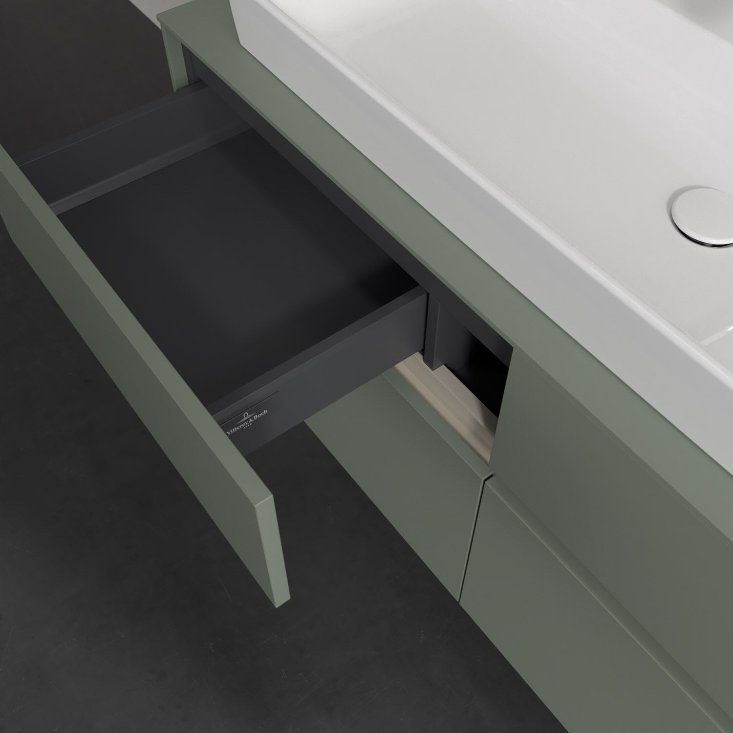 Stauraumwunder im zeitgemäßen Design: Der Villeroy & Boch Waschbeckenunterschrank aus der Collaro Kollektion eignet sich besonders für Familienbäder und bietet genau den Platz, der dort benötigt wird. Stimmungsvolles Highlight der schlichten, modernen Front ist die integrierte Griffmulde mit stufenlos einstellbarer LED-Beleuchtung. Im Inneren bietet das Möbelstück mit vier Auszügen erstaunlich viel Komfort – ermöglicht durch großzügiges Platzangebot und den integrierten Antirutschboden. Variabel setzbare Glasabtrennungen und mitgelieferte Accessory Boxen sorgen für den nötigen Überblick. Dank SoftClosing und Selbsteinzug lassen sich die Auszüge nach der Nutzung lautlos schließen. Die Front ist mit einer hochwertigen Lackierung versehen, deren Anti-Fingerprint-Oberfläche unschönen Fingerabdrücken vorbeugt.