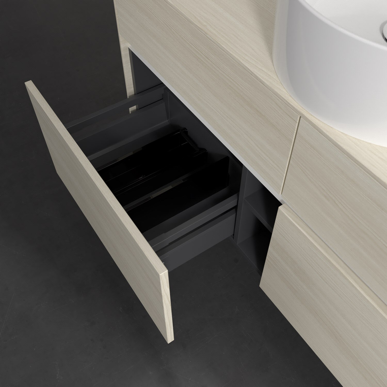 - kein Umfallen oder Verrutschen von Pflegeprodukten in den Schubladen dank rutschhemmendem Boden