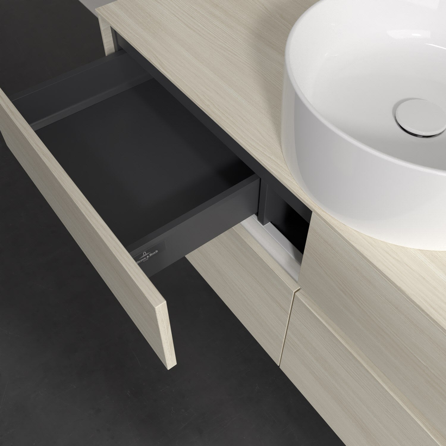 Stauraumwunder im zeitgemäßen Design: Der Villeroy & Boch Waschbeckenunterschrank aus der Collaro Kollektion eignet sich besonders für Familienbäder und bietet genau den Platz, der dort benötigt wird. Eine integrierte Griffleiste sorgt für eine schlichte, moderne Front. Im Inneren bietet das Möbelstück mit vier Auszügen erstaunlich viel Komfort – ermöglicht durch großzügiges Platzangebot und den integrierten Antirutschboden. Variabel setzbare Glasabtrennungen und mitgelieferte Accessory Boxen sorgen für den nötigen Überblick. Dank SoftClosing und Selbsteinzug lassen sich die Auszüge nach der Nutzung lautlos schließen. Für eine besonders leichte Reinigung sorgt die pflegeleichte Direktbeschichtung.
