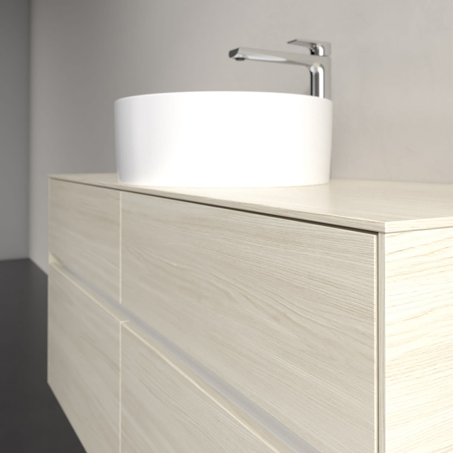Stauraumwunder im zeitgemäßen Design: Der Villeroy & Boch Waschbeckenunterschrank aus der Collaro Kollektion eignet sich besonders für Familienbäder und bietet genau den Platz, der dort benötigt wird. Stimmungsvolles Highlight der schlichten, modernen Front ist die integrierte Griffmulde mit stufenlos einstellbarer LED-Beleuchtung. Steuern lässt sie sich über einen Touch-Sensor seitlich am Unterschrank. Im Inneren bietet das Möbelstück mit vier Auszügen erstaunlich viel Komfort – ermöglicht durch großzügiges Platzangebot und den integrierten Antirutschboden. Variabel setzbare Glasabtrennungen und mitgelieferte Accessory Boxen sorgen für den nötigen Überblick. Dank SoftClosing und Selbsteinzug lassen sich die Auszüge nach der Nutzung lautlos schließen. Für eine besonders leichte Reinigung sorgt die pflegeleichte Direktbeschichtung.