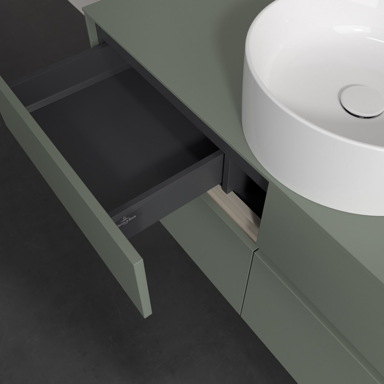 Stauraumwunder im zeitgemäßen Design: Der Villeroy & Boch Waschbeckenunterschrank aus der Collaro Kollektion eignet sich besonders für Familienbäder und bietet genau den Platz, der dort benötigt wird. Stimmungsvolles Highlight der schlichten, modernen Front ist die integrierte Griffmulde mit stufenlos einstellbarer LED-Beleuchtung. Steuern lässt sie sich über einen Touch-Sensor seitlich am Unterschrank. Im Inneren bietet das Möbelstück mit vier Auszügen erstaunlich viel Komfort – ermöglicht durch großzügiges Platzangebot und den integrierten Antirutschboden. Variabel setzbare Glasabtrennungen und mitgelieferte Accessory Boxen sorgen für den nötigen Überblick. Dank SoftClosing und Selbsteinzug lassen sich die Auszüge nach der Nutzung lautlos schließen. Die Front ist mit einer hochwertigen Lackierung versehen, deren Anti-Fingerprint-Oberfläche unschönen Fingerabdrücken vorbeugt.