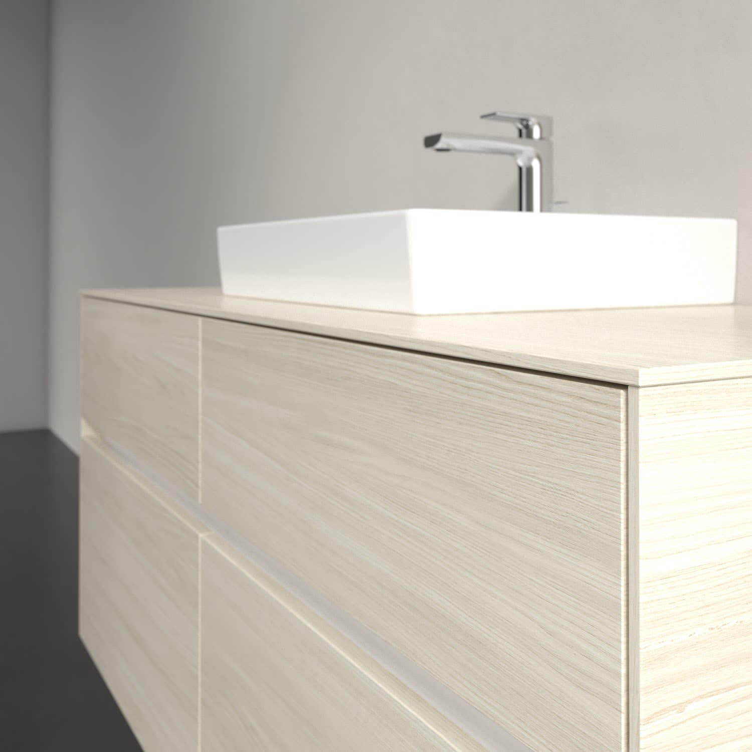 Stauraumwunder im zeitgemäßen Design: Der Villeroy & Boch Waschbeckenunterschrank aus der Collaro Kollektion eignet sich besonders für Familienbäder und bietet genau den Platz, der dort benötigt wird. Stimmungsvolles Highlight der schlichten, modernen Front ist die integrierte Griffmulde mit stufenlos einstellbarer LED-Beleuchtung. Im Inneren bietet das Möbelstück mit vier Auszügen erstaunlich viel Komfort – ermöglicht durch großzügiges Platzangebot und den integrierten Antirutschboden. Variabel setzbare Glasabtrennungen und mitgelieferte Accessory Boxen sorgen für den nötigen Überblick. Dank SoftClosing und Selbsteinzug lassen sich die Auszüge nach der Nutzung lautlos schließen. Für eine besonders leichte Reinigung sorgt die pflegeleichte Direktbeschichtung.