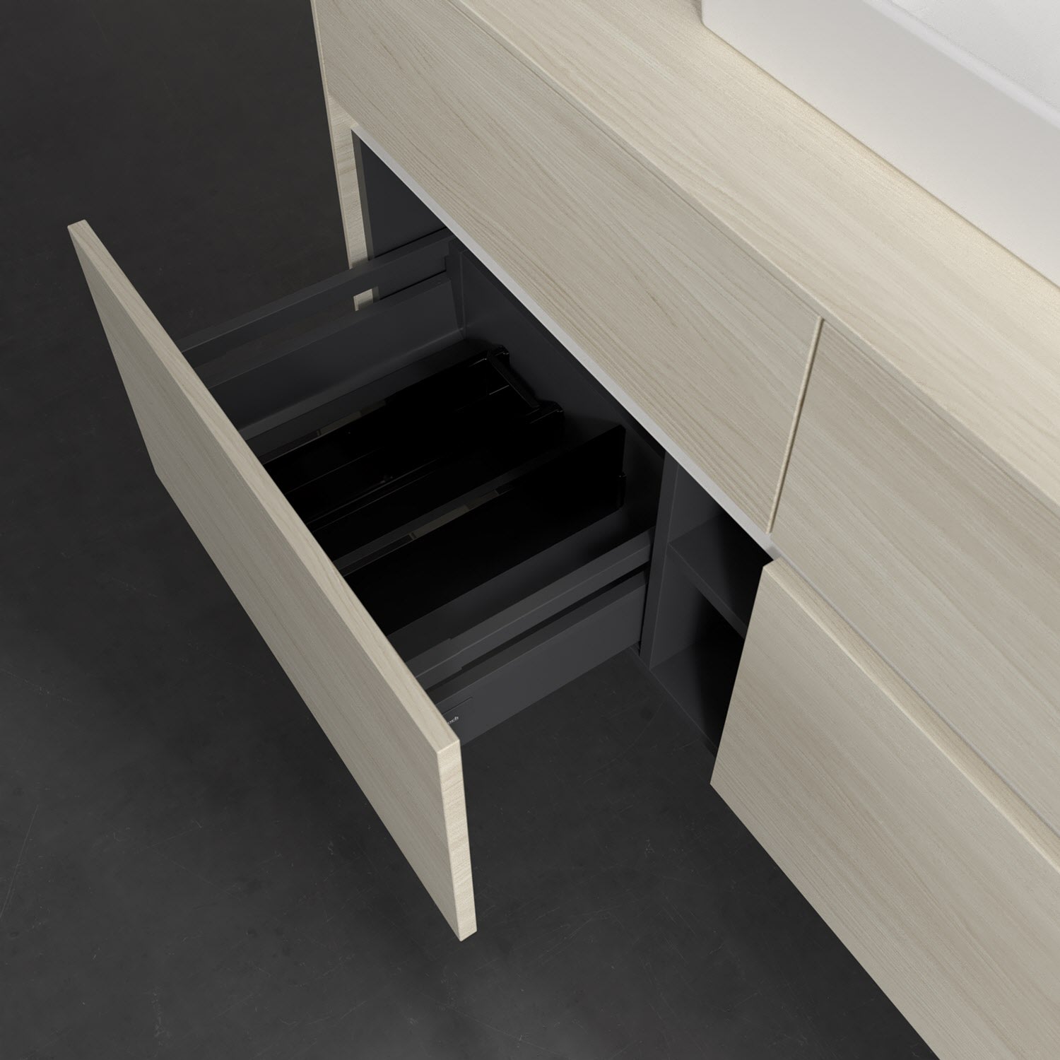 - kein Umfallen oder Verrutschen von Pflegeprodukten in den Schubladen dank rutschhemmendem Boden
