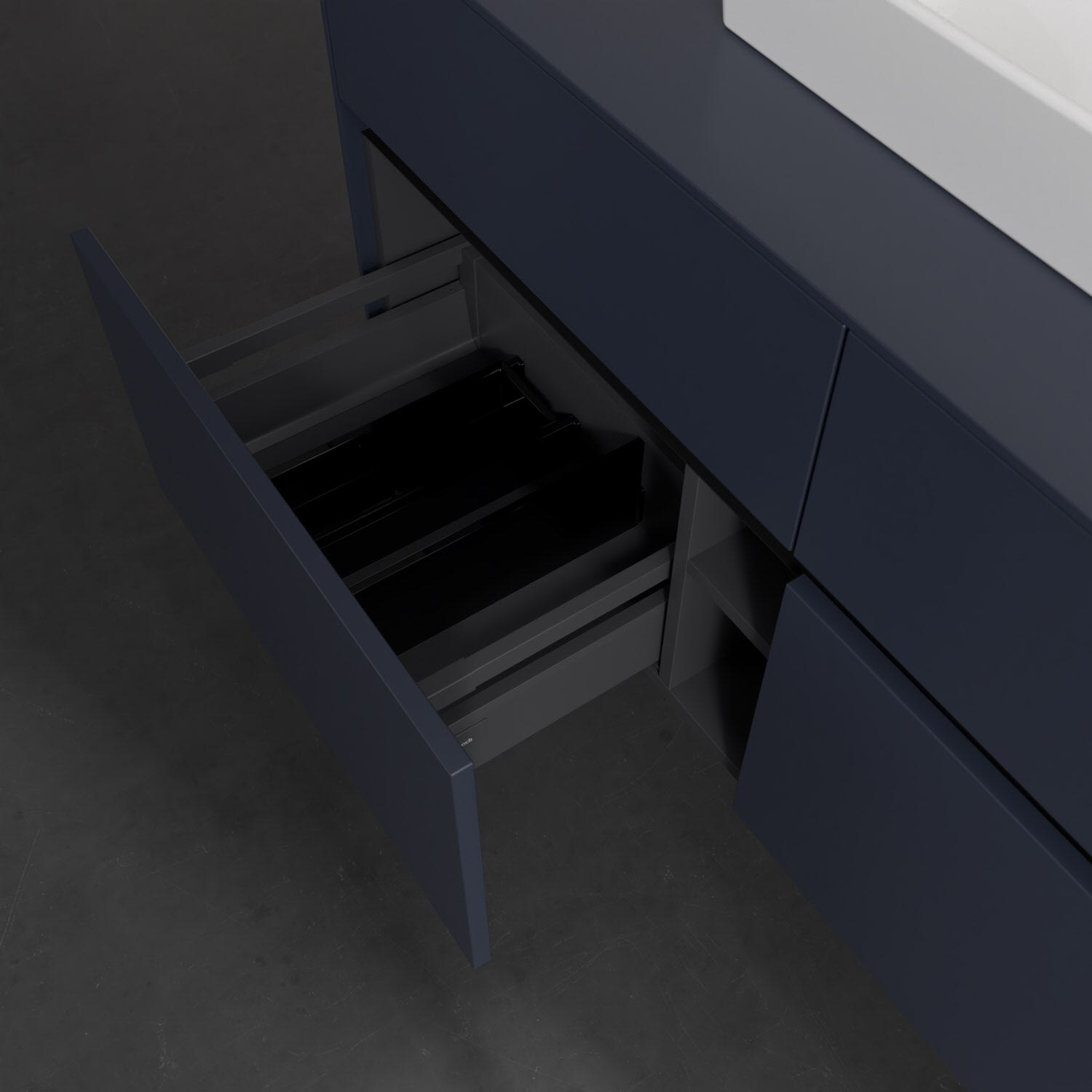 - kein Umfallen oder Verrutschen von Pflegeprodukten in den Schubladen dank rutschhemmendem Boden