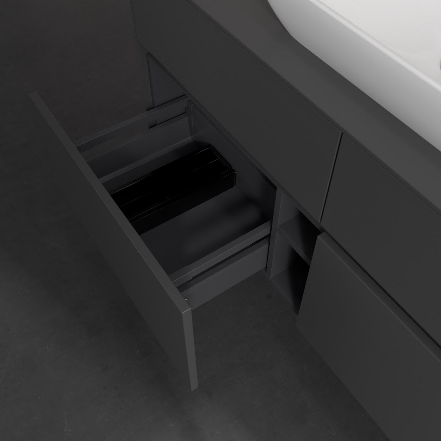 Stauraumwunder im zeitgemäßen Design: Der Villeroy & Boch Waschbeckenunterschrank aus der Collaro Kollektion eignet sich besonders für Familienbäder und bietet genau den Platz, der dort benötigt wird. Stimmungsvolles Highlight der schlichten, modernen Front ist die integrierte Griffmulde mit stufenlos einstellbarer LED-Beleuchtung. Im Inneren bietet das Möbelstück mit vier Auszügen erstaunlich viel Komfort – ermöglicht durch großzügiges Platzangebot und den integrierten Antirutschboden. Variabel setzbare Glasabtrennungen und mitgelieferte Accessory Boxen sorgen für den nötigen Überblick. Dank SoftClosing und Selbsteinzug lassen sich die Auszüge nach der Nutzung lautlos schließen. Die Front ist mit einer hochwertigen Lackierung versehen, deren Anti-Fingerprint-Oberfläche unschönen Fingerabdrücken vorbeugt.