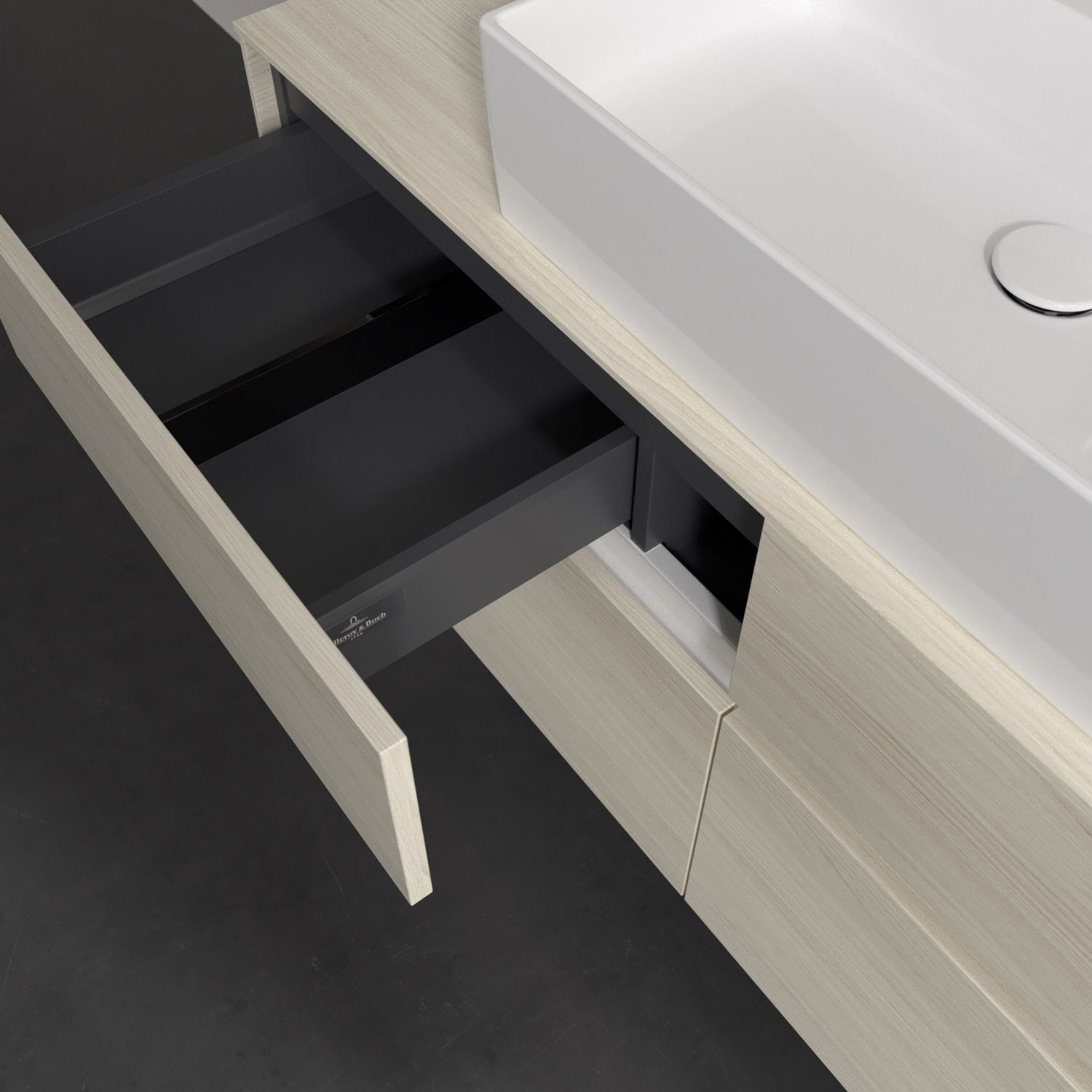 Stauraumwunder im zeitgemäßen Design: Der Villeroy & Boch Waschbeckenunterschrank aus der Collaro Kollektion eignet sich besonders für Familienbäder und bietet genau den Platz, der dort benötigt wird. Stimmungsvolles Highlight der schlichten, modernen Front ist die integrierte Griffmulde mit stufenlos einstellbarer LED-Beleuchtung. Im Inneren bietet das Möbelstück mit vier Auszügen erstaunlich viel Komfort – ermöglicht durch großzügiges Platzangebot und den integrierten Antirutschboden. Variabel setzbare Glasabtrennungen und mitgelieferte Accessory Boxen sorgen für den nötigen Überblick. Dank SoftClosing und Selbsteinzug lassen sich die Auszüge nach der Nutzung lautlos schließen. Für eine besonders leichte Reinigung sorgt die pflegeleichte Direktbeschichtung.