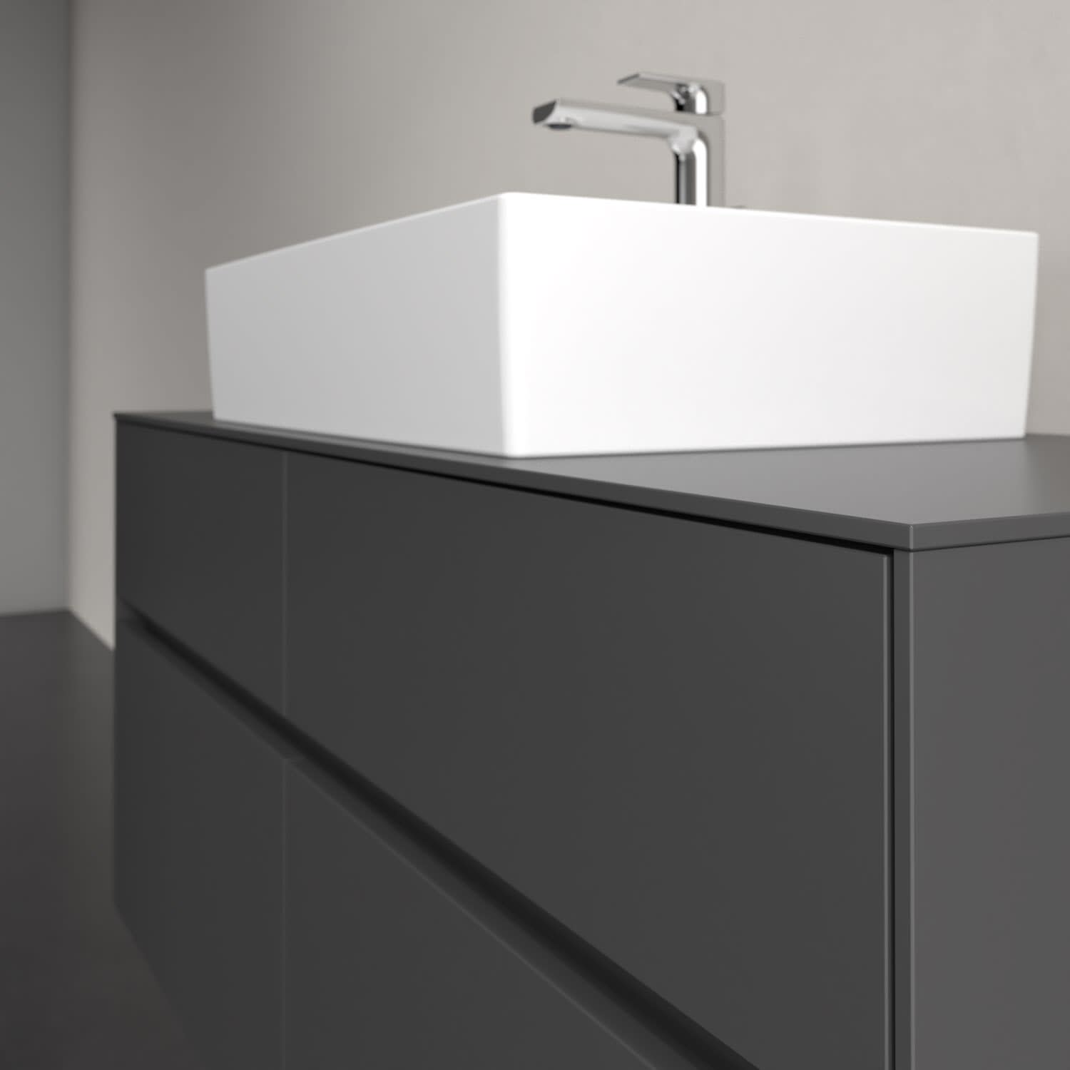 Stauraumwunder im zeitgemäßen Design: Der Villeroy & Boch Waschbeckenunterschrank aus der Collaro Kollektion eignet sich besonders für Familienbäder und bietet genau den Platz, der dort benötigt wird. Eine integrierte Griffleiste sorgt für eine schlichte, moderne Front. Steuern lässt sich das Licht über einen Touch-Sensor seitlich am Unterschrank. Im Inneren bietet das Möbelstück mit vier Auszügen erstaunlich viel Komfort – ermöglicht durch großzügiges Platzangebot und den integrierten Antirutschboden. Variabel setzbare Glasabtrennungen und mitgelieferte Accessory Boxen sorgen für den nötigen Überblick. Dank SoftClosing und Selbsteinzug lassen sich die Auszüge nach der Nutzung lautlos schließen. Die Front ist mit einer hochwertigen Lackierung versehen, deren Anti-Fingerprint-Oberfläche unschönen Fingerabdrücken vorbeugt.