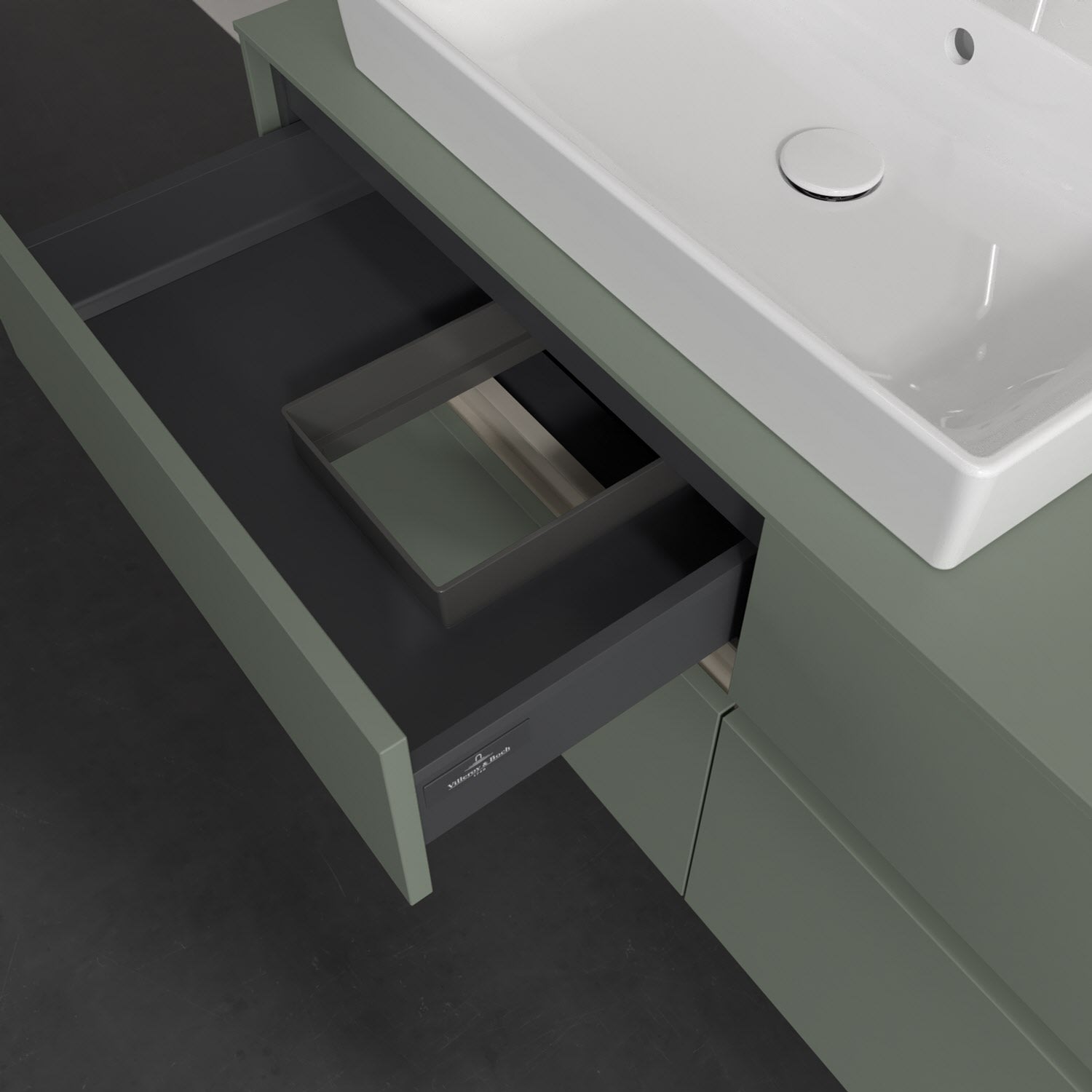 Stauraumwunder im zeitgemäßen Design: Der Villeroy & Boch Waschbeckenunterschrank aus der Collaro Kollektion eignet sich besonders für Familienbäder und bietet genau den Platz, der dort benötigt wird. Stimmungsvolles Highlight der schlichten, modernen Front ist die integrierte Griffmulde mit stufenlos einstellbarer LED-Beleuchtung. Im Inneren bietet das Möbelstück mit vier Auszügen erstaunlich viel Komfort – ermöglicht durch großzügiges Platzangebot und den integrierten Antirutschboden. Variabel setzbare Glasabtrennungen und mitgelieferte Accessory Boxen sorgen für den nötigen Überblick. Dank SoftClosing und Selbsteinzug lassen sich die Auszüge nach der Nutzung lautlos schließen. Die Front ist mit einer hochwertigen Lackierung versehen, deren Anti-Fingerprint-Oberfläche unschönen Fingerabdrücken vorbeugt.
