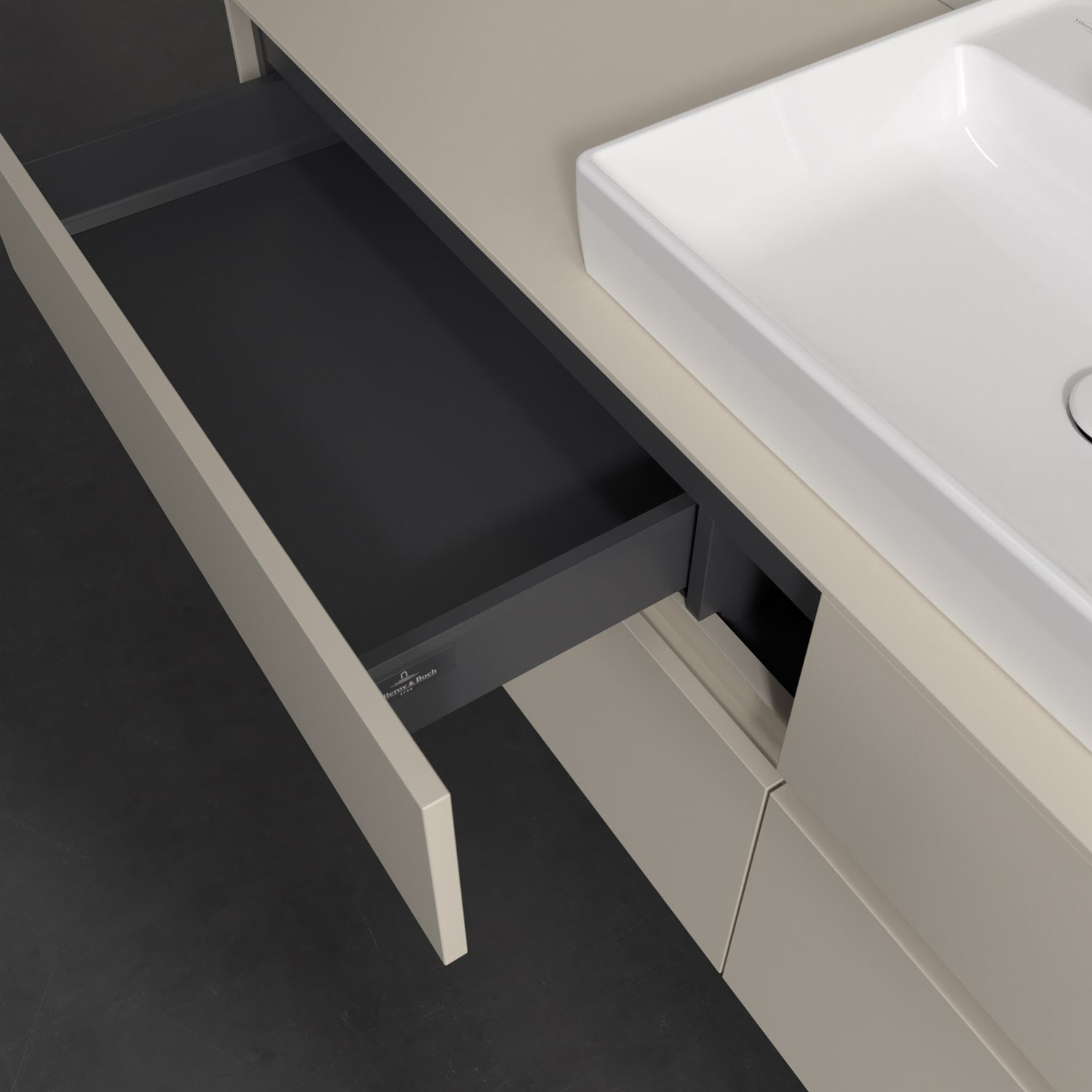 Stauraumwunder im zeitgemäßen Design: Der Villeroy & Boch Waschbeckenunterschrank aus der Collaro Kollektion eignet sich besonders für Familienbäder und bietet genau den Platz, der dort benötigt wird. Stimmungsvolles Highlight der schlichten, modernen Front ist die integrierte Griffmulde mit stufenlos einstellbarer LED-Beleuchtung. Steuern lässt sie sich über einen Touch-Sensor seitlich am Unterschrank. Im Inneren bietet das Möbelstück mit vier Auszügen erstaunlich viel Komfort – ermöglicht durch großzügiges Platzangebot und den integrierten Antirutschboden. Variabel setzbare Glasabtrennungen und mitgelieferte Accessory Boxen sorgen für den nötigen Überblick. Dank SoftClosing und Selbsteinzug lassen sich die Auszüge nach der Nutzung lautlos schließen. Die Front ist mit einer hochwertigen Lackierung versehen, deren Anti-Fingerprint-Oberfläche unschönen Fingerabdrücken vorbeugt.