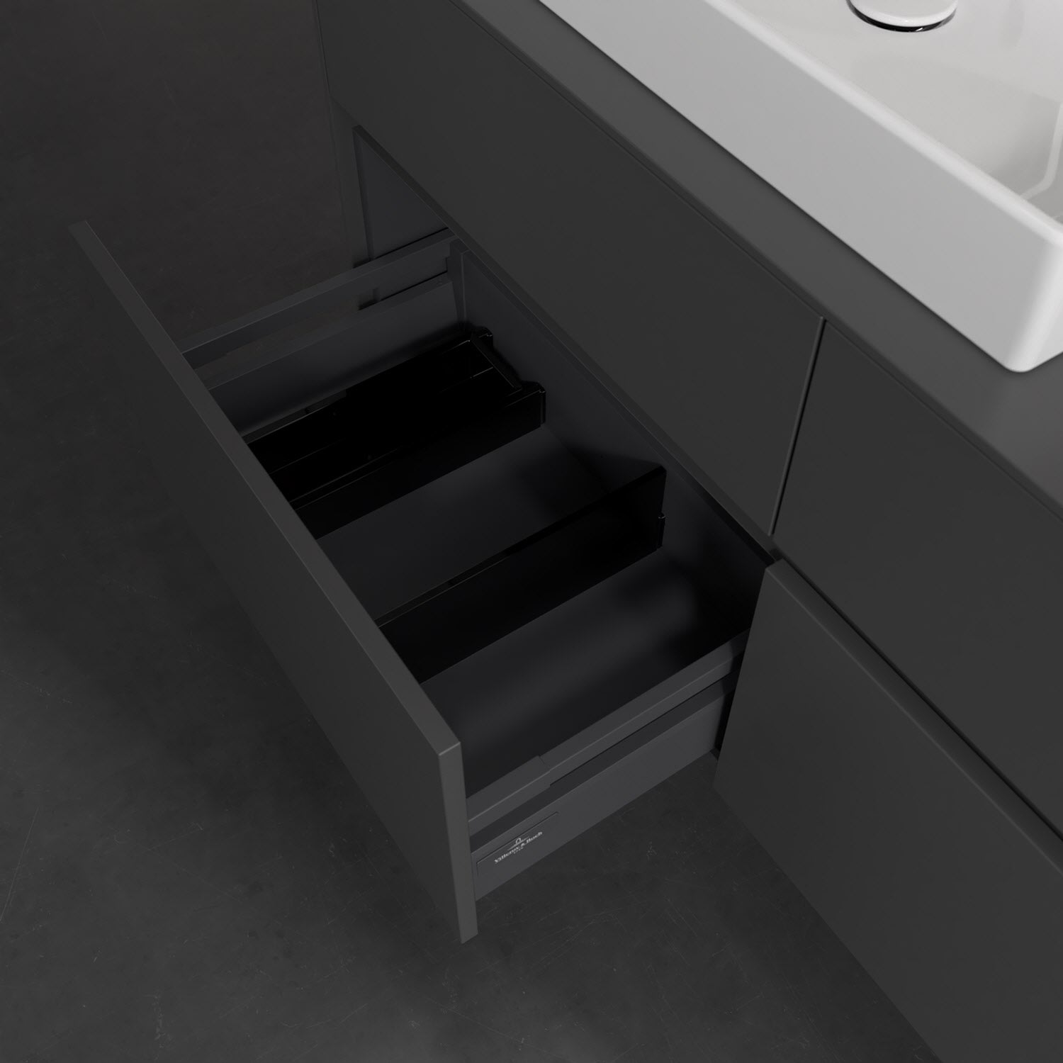 Stauraumwunder im zeitgemäßen Design: Der Villeroy & Boch Waschbeckenunterschrank aus der Collaro Kollektion eignet sich besonders für Familienbäder und bietet genau den Platz, der dort benötigt wird. Eine integrierte Griffleiste sorgt für eine schlichte, moderne Front. Steuern lässt sich das Licht über einen Touch-Sensor seitlich am Unterschrank. Im Inneren bietet das Möbelstück mit vier Auszügen erstaunlich viel Komfort – ermöglicht durch großzügiges Platzangebot und den integrierten Antirutschboden. Variabel setzbare Glasabtrennungen und mitgelieferte Accessory Boxen sorgen für den nötigen Überblick. Dank SoftClosing und Selbsteinzug lassen sich die Auszüge nach der Nutzung lautlos schließen. Die Front ist mit einer hochwertigen Lackierung versehen, deren Anti-Fingerprint-Oberfläche unschönen Fingerabdrücken vorbeugt.