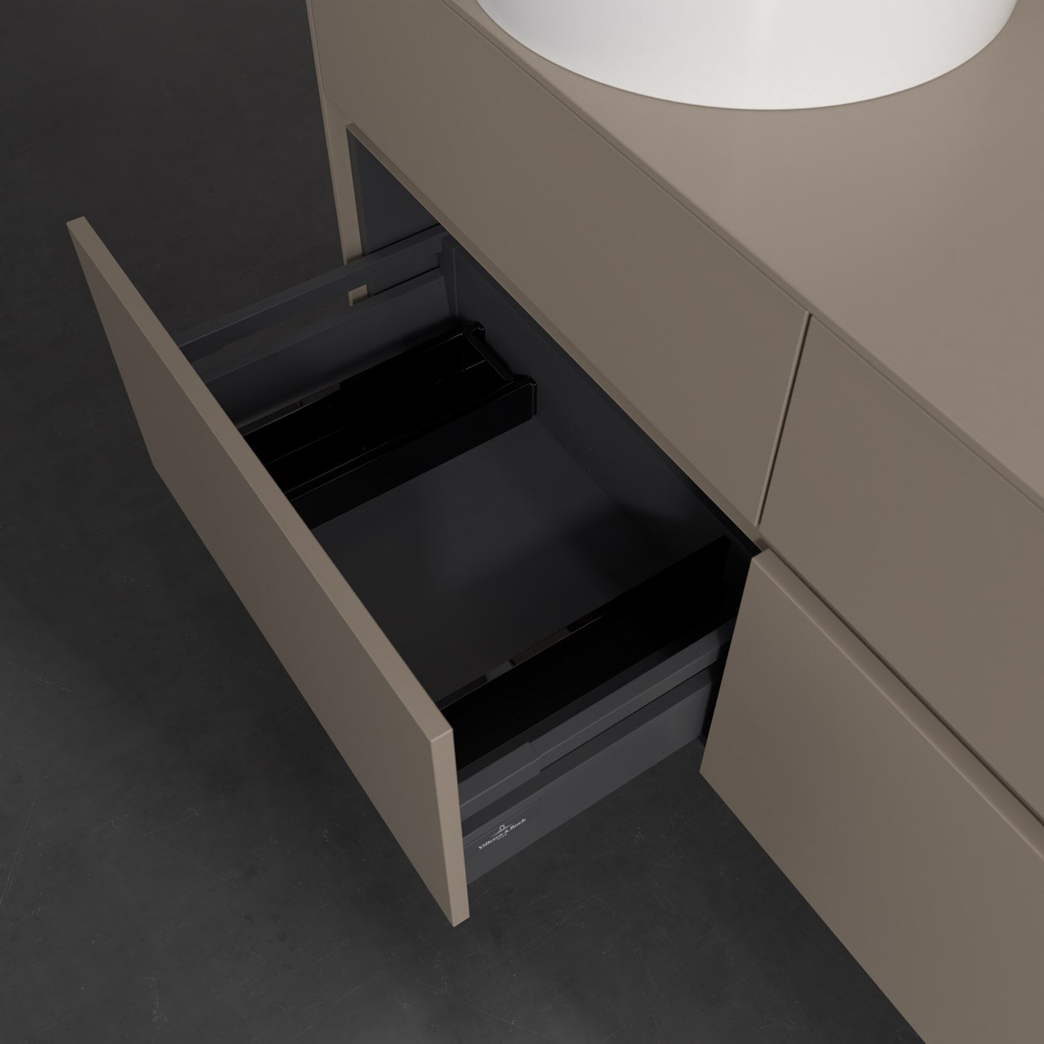 Stauraumwunder im zeitgemäßen Design: Der Villeroy & Boch Waschbeckenunterschrank aus der Collaro Kollektion eignet sich besonders für Familienbäder und bietet genau den Platz, der dort benötigt wird. Eine integrierte Griffleiste sorgt für eine schlichte, moderne Front. Im Inneren bietet das Möbelstück mit vier Auszügen erstaunlich viel Komfort – ermöglicht durch großzügiges Platzangebot und den integrierten Antirutschboden. Variabel setzbare Glasabtrennungen und mitgelieferte Accessory Boxen sorgen für den nötigen Überblick. Dank SoftClosing und Selbsteinzug lassen sich die Auszüge nach der Nutzung lautlos schließen. Die Front ist mit einer hochwertigen Lackierung versehen, deren Anti-Fingerprint-Oberfläche unschönen Fingerabdrücken vorbeugt.