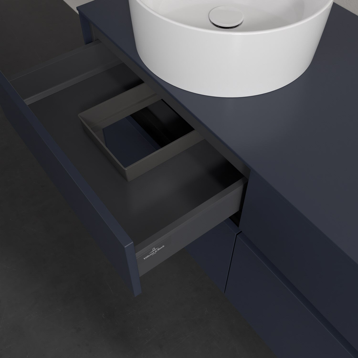 Stauraumwunder im zeitgemäßen Design: Der Villeroy & Boch Waschbeckenunterschrank aus der Collaro Kollektion eignet sich besonders für Familienbäder und bietet genau den Platz, der dort benötigt wird. Stimmungsvolles Highlight der schlichten, modernen Front ist die integrierte Griffmulde mit stufenlos einstellbarer LED-Beleuchtung. Steuern lässt sie sich über einen Touch-Sensor seitlich am Unterschrank. Im Inneren bietet das Möbelstück mit vier Auszügen erstaunlich viel Komfort – ermöglicht durch großzügiges Platzangebot und den integrierten Antirutschboden. Variabel setzbare Glasabtrennungen und mitgelieferte Accessory Boxen sorgen für den nötigen Überblick. Dank SoftClosing und Selbsteinzug lassen sich die Auszüge nach der Nutzung lautlos schließen. Die Front ist mit einer hochwertigen Lackierung versehen, deren Anti-Fingerprint-Oberfläche unschönen Fingerabdrücken vorbeugt.