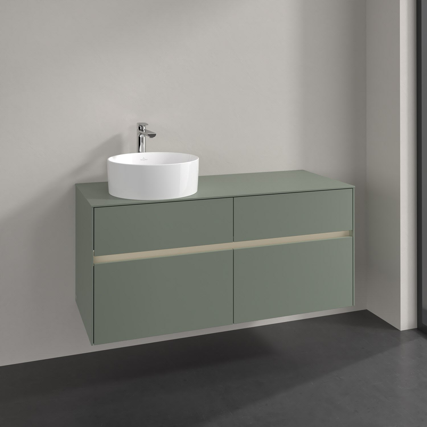 Stauraumwunder im zeitgemäßen Design: Der Villeroy & Boch Waschbeckenunterschrank aus der Collaro Kollektion eignet sich besonders für Familienbäder und bietet genau den Platz, der dort benötigt wird. Stimmungsvolles Highlight der schlichten, modernen Front ist die integrierte Griffmulde mit stufenlos einstellbarer LED-Beleuchtung. Steuern lässt sie sich über einen Touch-Sensor seitlich am Unterschrank. Im Inneren bietet das Möbelstück mit vier Auszügen erstaunlich viel Komfort – ermöglicht durch großzügiges Platzangebot und den integrierten Antirutschboden. Variabel setzbare Glasabtrennungen und mitgelieferte Accessory Boxen sorgen für den nötigen Überblick. Dank SoftClosing und Selbsteinzug lassen sich die Auszüge nach der Nutzung lautlos schließen. Die Front ist mit einer hochwertigen Lackierung versehen, deren Anti-Fingerprint-Oberfläche unschönen Fingerabdrücken vorbeugt.