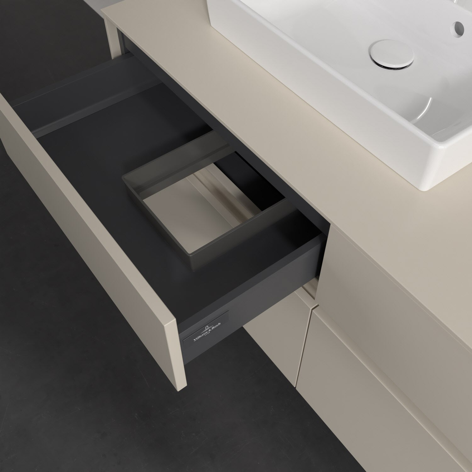 Stauraumwunder im zeitgemäßen Design: Der Villeroy & Boch Waschbeckenunterschrank aus der Collaro Kollektion eignet sich besonders für Familienbäder und bietet genau den Platz, der dort benötigt wird. Stimmungsvolles Highlight der schlichten, modernen Front ist die integrierte Griffmulde mit stufenlos einstellbarer LED-Beleuchtung. Im Inneren bietet das Möbelstück mit vier Auszügen erstaunlich viel Komfort – ermöglicht durch großzügiges Platzangebot und den integrierten Antirutschboden. Variabel setzbare Glasabtrennungen und mitgelieferte Accessory Boxen sorgen für den nötigen Überblick. Dank SoftClosing und Selbsteinzug lassen sich die Auszüge nach der Nutzung lautlos schließen. Die Front ist mit einer hochwertigen Lackierung versehen, deren Anti-Fingerprint-Oberfläche unschönen Fingerabdrücken vorbeugt.