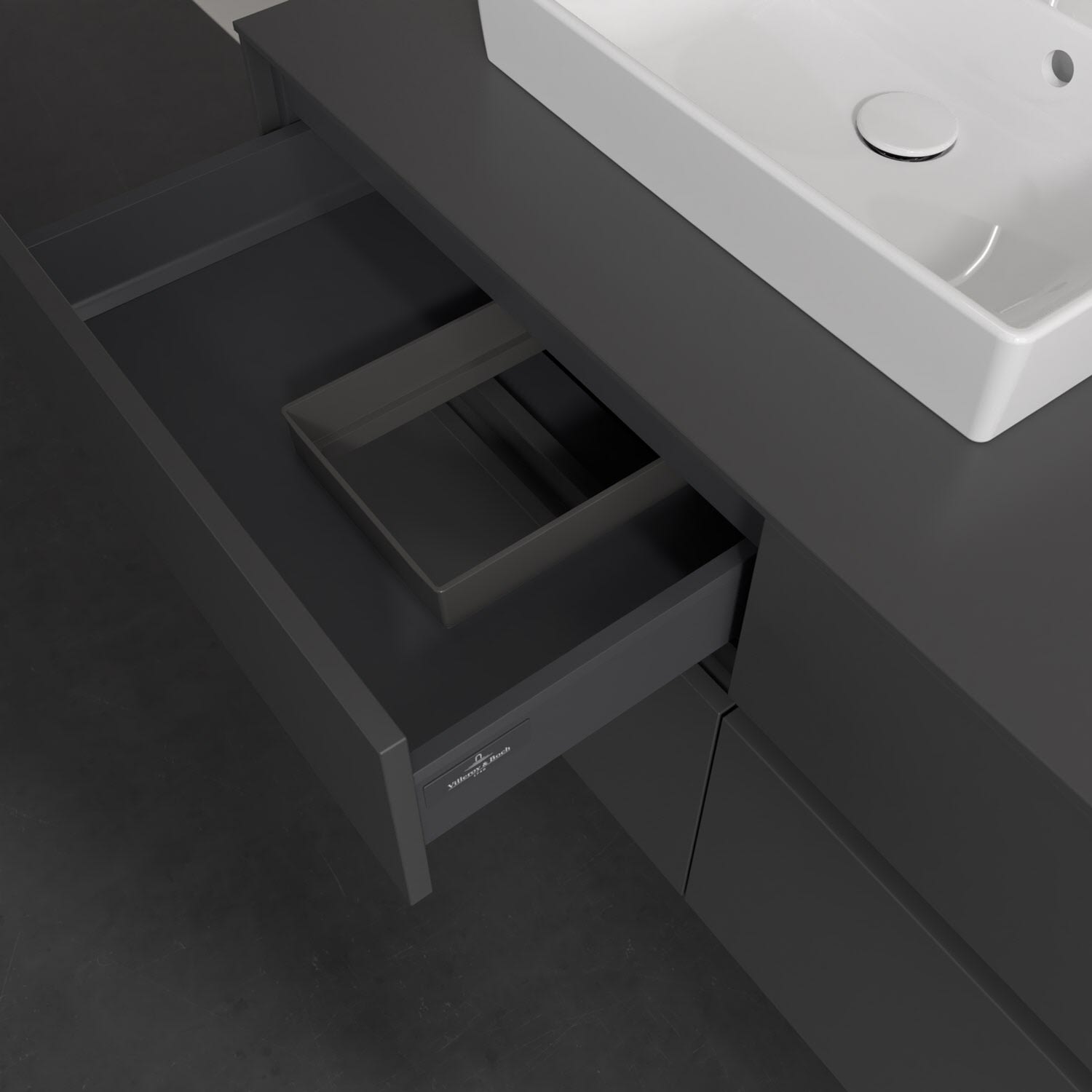 Stauraumwunder im zeitgemäßen Design: Der Villeroy & Boch Waschbeckenunterschrank aus der Collaro Kollektion eignet sich besonders für Familienbäder und bietet genau den Platz, der dort benötigt wird. Stimmungsvolles Highlight der schlichten, modernen Front ist die integrierte Griffmulde mit stufenlos einstellbarer LED-Beleuchtung. Im Inneren bietet das Möbelstück mit vier Auszügen erstaunlich viel Komfort – ermöglicht durch großzügiges Platzangebot und den integrierten Antirutschboden. Variabel setzbare Glasabtrennungen und mitgelieferte Accessory Boxen sorgen für den nötigen Überblick. Dank SoftClosing und Selbsteinzug lassen sich die Auszüge nach der Nutzung lautlos schließen. Die Front ist mit einer hochwertigen Lackierung versehen, deren Anti-Fingerprint-Oberfläche unschönen Fingerabdrücken vorbeugt.