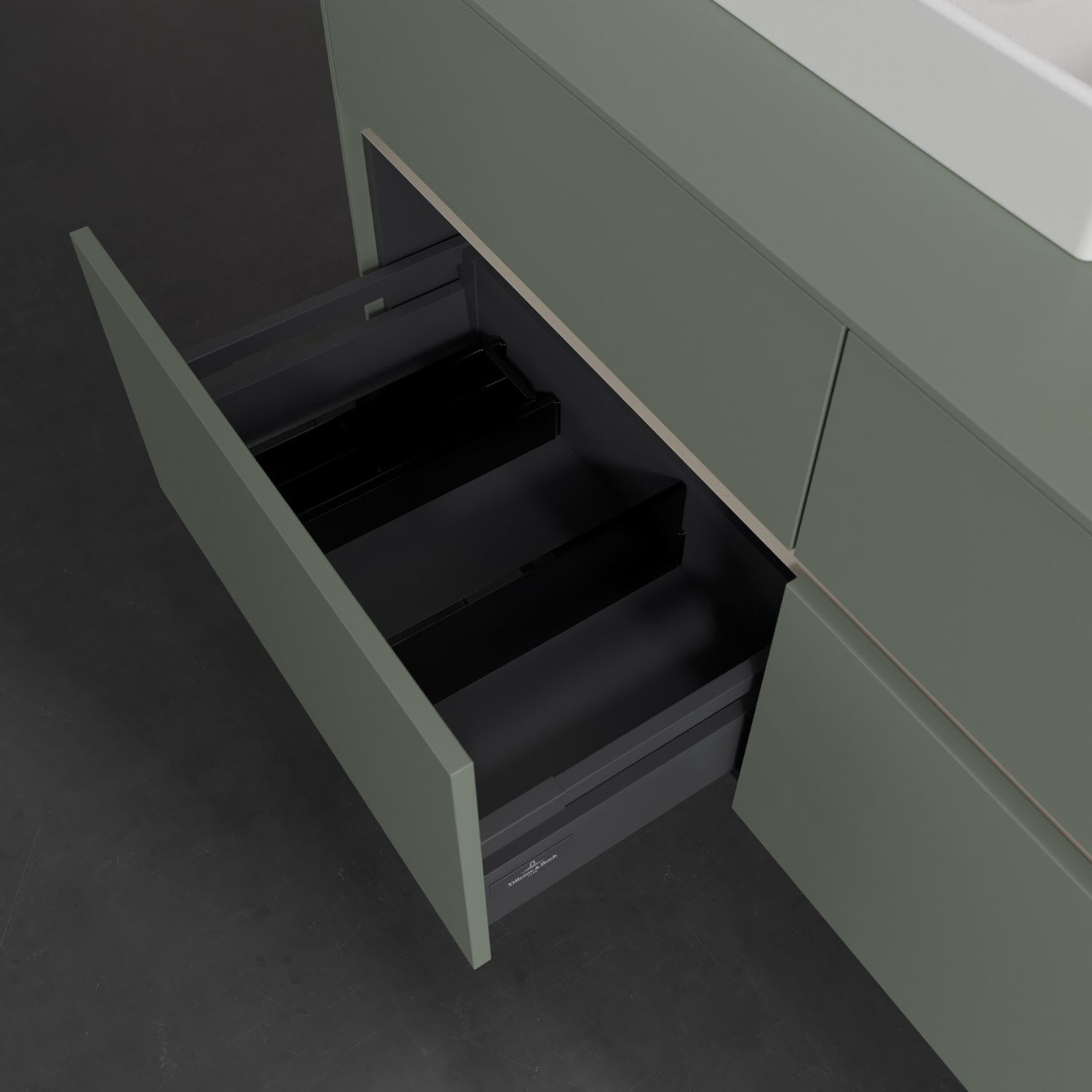 Stauraumwunder im zeitgemäßen Design: Der Villeroy & Boch Waschbeckenunterschrank aus der Collaro Kollektion eignet sich besonders für Familienbäder und bietet genau den Platz, der dort benötigt wird. Stimmungsvolles Highlight der schlichten, modernen Front ist die integrierte Griffmulde mit stufenlos einstellbarer LED-Beleuchtung. Im Inneren bietet das Möbelstück mit vier Auszügen erstaunlich viel Komfort – ermöglicht durch großzügiges Platzangebot und den integrierten Antirutschboden. Variabel setzbare Glasabtrennungen und mitgelieferte Accessory Boxen sorgen für den nötigen Überblick. Dank SoftClosing und Selbsteinzug lassen sich die Auszüge nach der Nutzung lautlos schließen. Die Front ist mit einer hochwertigen Lackierung versehen, deren Anti-Fingerprint-Oberfläche unschönen Fingerabdrücken vorbeugt.