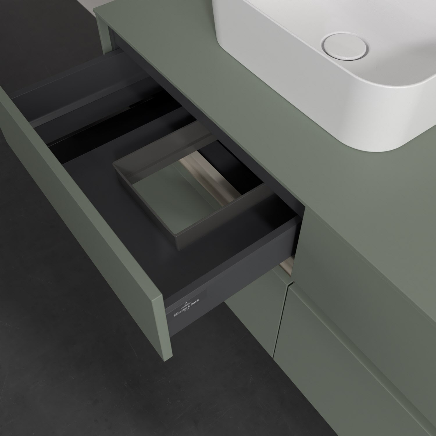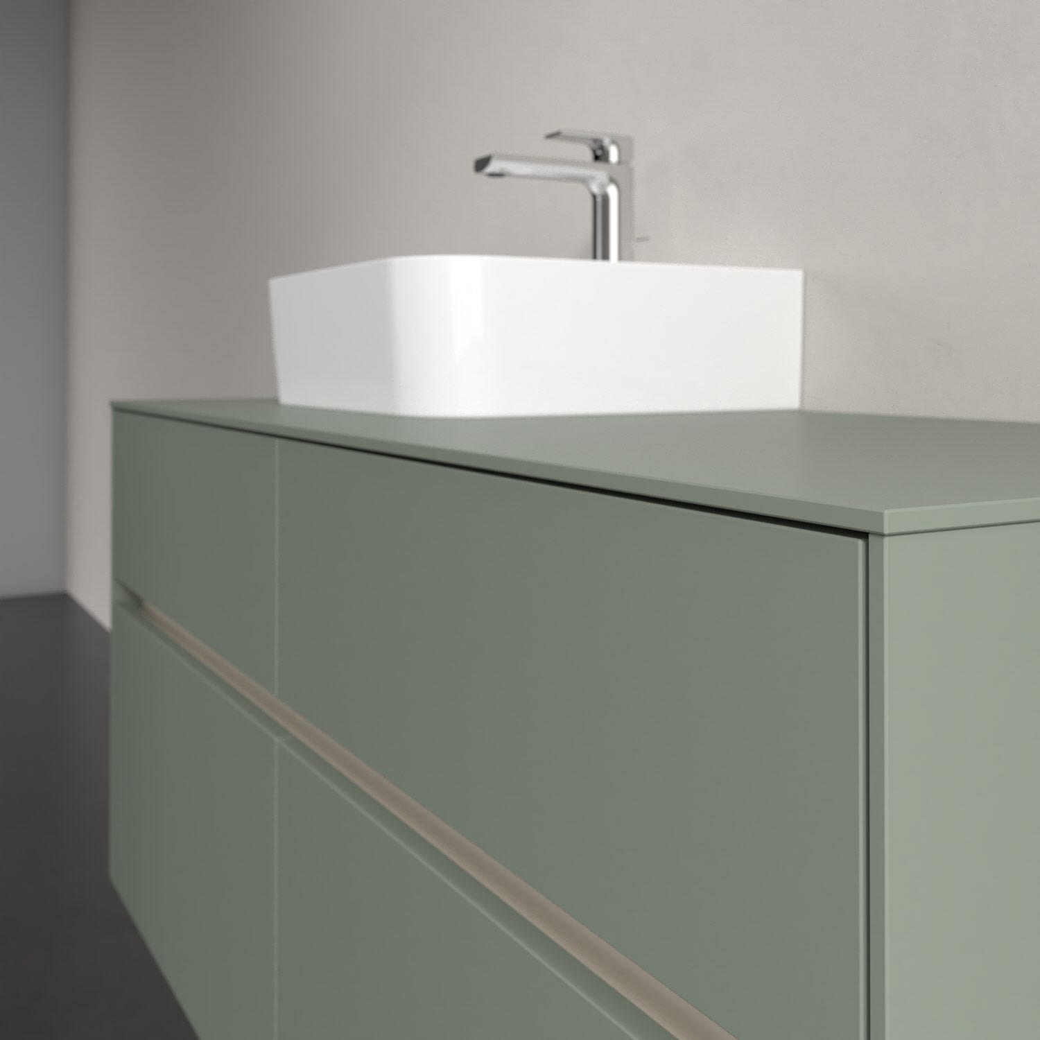 Stauraumwunder im zeitgemäßen Design: Der Villeroy & Boch Waschbeckenunterschrank aus der Collaro Kollektion eignet sich besonders für Familienbäder und bietet genau den Platz, der dort benötigt wird. Stimmungsvolles Highlight der schlichten, modernen Front ist die integrierte Griffmulde mit stufenlos einstellbarer LED-Beleuchtung. Im Inneren bietet das Möbelstück mit vier Auszügen erstaunlich viel Komfort – ermöglicht durch großzügiges Platzangebot und den integrierten Antirutschboden. Variabel setzbare Glasabtrennungen und mitgelieferte Accessory Boxen sorgen für den nötigen Überblick. Dank SoftClosing und Selbsteinzug lassen sich die Auszüge nach der Nutzung lautlos schließen. Die Front ist mit einer hochwertigen Lackierung versehen, deren Anti-Fingerprint-Oberfläche unschönen Fingerabdrücken vorbeugt.
