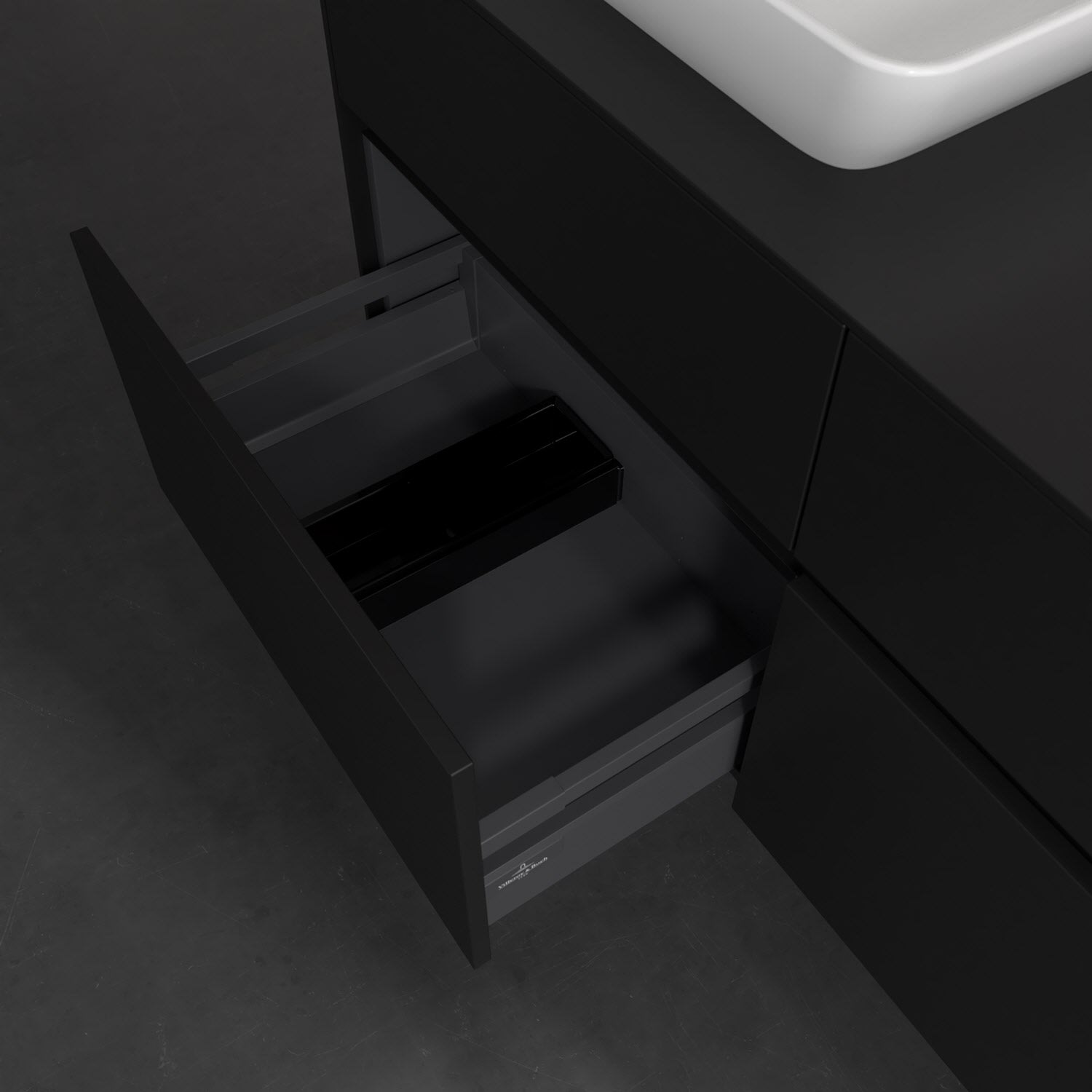 Stauraumwunder im zeitgemäßen Design: Der Villeroy & Boch Waschbeckenunterschrank aus der Collaro Kollektion eignet sich besonders für Familienbäder und bietet genau den Platz, der dort benötigt wird. Stimmungsvolles Highlight der schlichten, modernen Front ist die integrierte Griffmulde mit stufenlos einstellbarer LED-Beleuchtung. Im Inneren bietet das Möbelstück mit vier Auszügen erstaunlich viel Komfort – ermöglicht durch großzügiges Platzangebot und den integrierten Antirutschboden. Variabel setzbare Glasabtrennungen und mitgelieferte Accessory Boxen sorgen für den nötigen Überblick. Dank SoftClosing und Selbsteinzug lassen sich die Auszüge nach der Nutzung lautlos schließen. Die Front ist mit einer hochwertigen Lackierung versehen, deren Anti-Fingerprint-Oberfläche unschönen Fingerabdrücken vorbeugt.