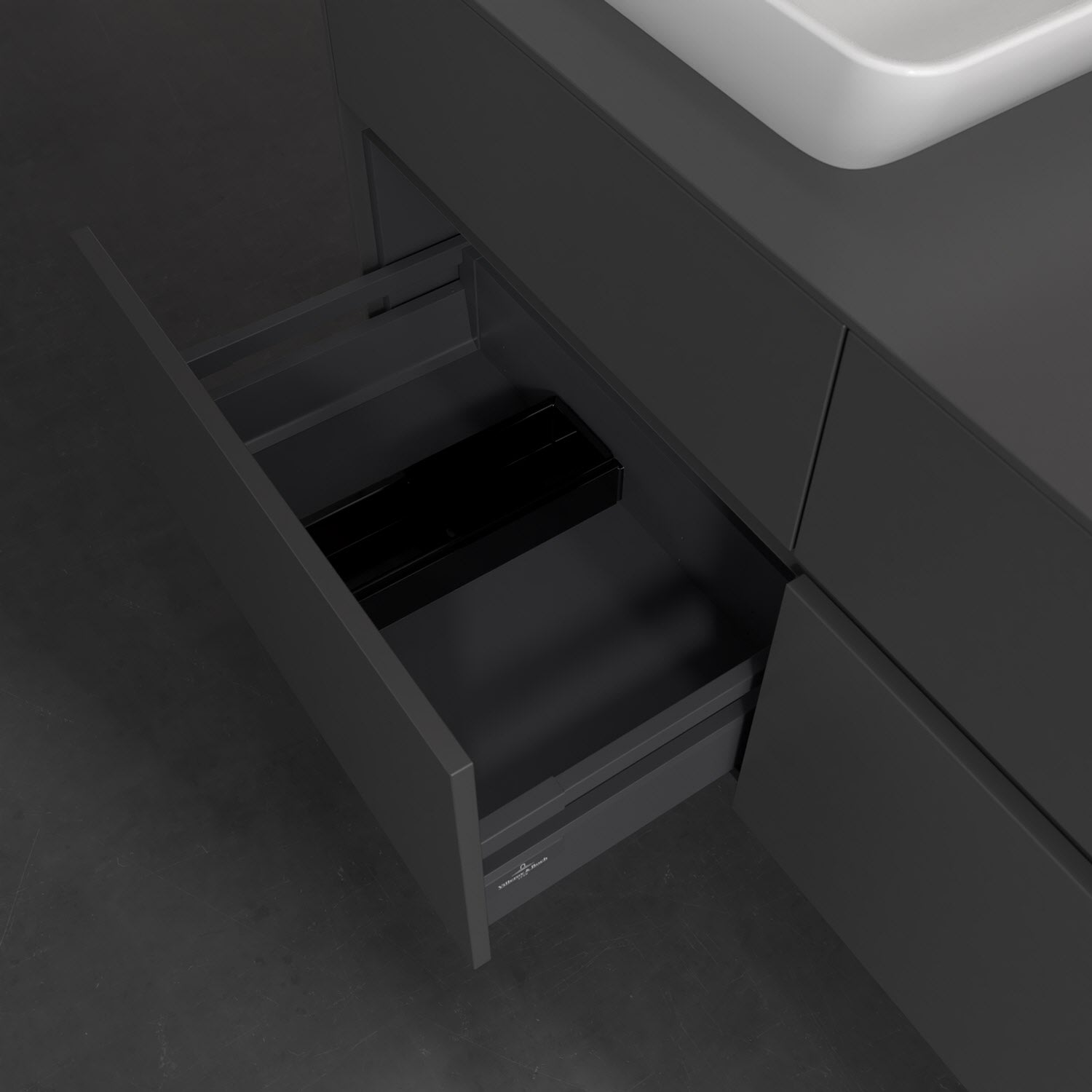Stauraumwunder im zeitgemäßen Design: Der Villeroy & Boch Waschbeckenunterschrank aus der Collaro Kollektion eignet sich besonders für Familienbäder und bietet genau den Platz, der dort benötigt wird. Eine integrierte Griffleiste sorgt für eine schlichte, moderne Front. Steuern lässt sich das Licht über einen Touch-Sensor seitlich am Unterschrank. Im Inneren bietet das Möbelstück mit vier Auszügen erstaunlich viel Komfort – ermöglicht durch großzügiges Platzangebot und den integrierten Antirutschboden. Variabel setzbare Glasabtrennungen und mitgelieferte Accessory Boxen sorgen für den nötigen Überblick. Dank SoftClosing und Selbsteinzug lassen sich die Auszüge nach der Nutzung lautlos schließen. Die Front ist mit einer hochwertigen Lackierung versehen, deren Anti-Fingerprint-Oberfläche unschönen Fingerabdrücken vorbeugt.