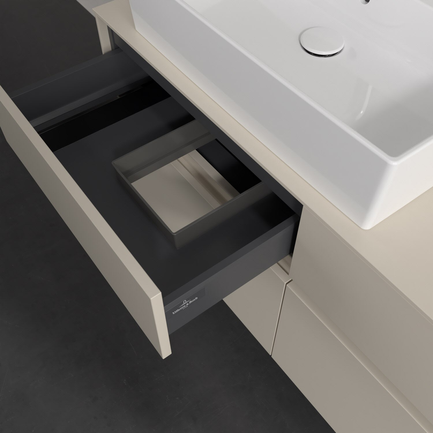 Stauraumwunder im zeitgemäßen Design: Der Villeroy & Boch Waschbeckenunterschrank aus der Collaro Kollektion eignet sich besonders für Familienbäder und bietet genau den Platz, der dort benötigt wird. Stimmungsvolles Highlight der schlichten, modernen Front ist die integrierte Griffmulde mit stufenlos einstellbarer LED-Beleuchtung. Im Inneren bietet das Möbelstück mit vier Auszügen erstaunlich viel Komfort – ermöglicht durch großzügiges Platzangebot und den integrierten Antirutschboden. Variabel setzbare Glasabtrennungen und mitgelieferte Accessory Boxen sorgen für den nötigen Überblick. Dank SoftClosing und Selbsteinzug lassen sich die Auszüge nach der Nutzung lautlos schließen. Die Front ist mit einer hochwertigen Lackierung versehen, deren Anti-Fingerprint-Oberfläche unschönen Fingerabdrücken vorbeugt.