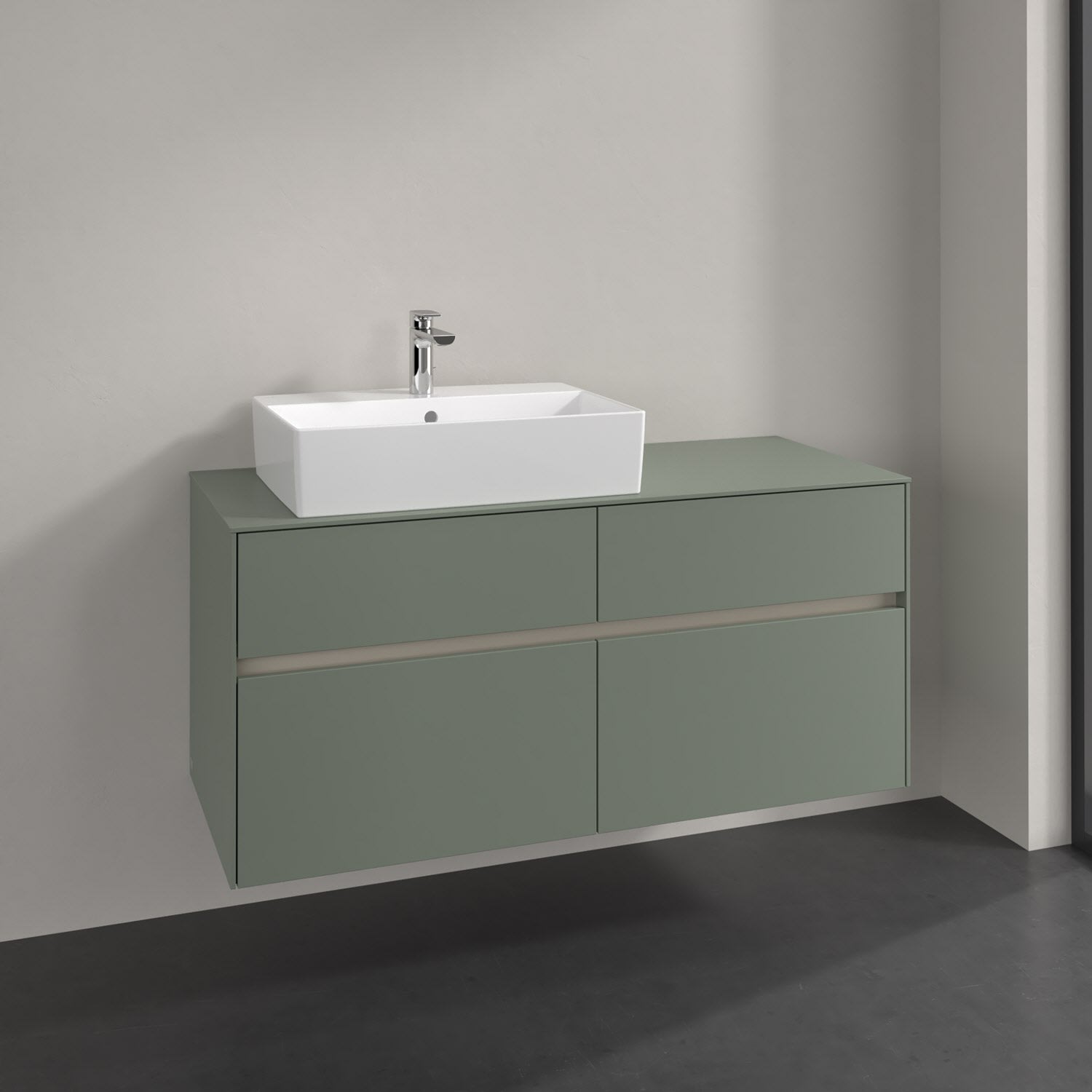 Stauraumwunder im zeitgemäßen Design: Der Villeroy & Boch Waschbeckenunterschrank aus der Collaro Kollektion eignet sich besonders für Familienbäder und bietet genau den Platz, der dort benötigt wird. Stimmungsvolles Highlight der schlichten, modernen Front ist die integrierte Griffmulde mit stufenlos einstellbarer LED-Beleuchtung. Im Inneren bietet das Möbelstück mit vier Auszügen erstaunlich viel Komfort – ermöglicht durch großzügiges Platzangebot und den integrierten Antirutschboden. Variabel setzbare Glasabtrennungen und mitgelieferte Accessory Boxen sorgen für den nötigen Überblick. Dank SoftClosing und Selbsteinzug lassen sich die Auszüge nach der Nutzung lautlos schließen. Die Front ist mit einer hochwertigen Lackierung versehen, deren Anti-Fingerprint-Oberfläche unschönen Fingerabdrücken vorbeugt.