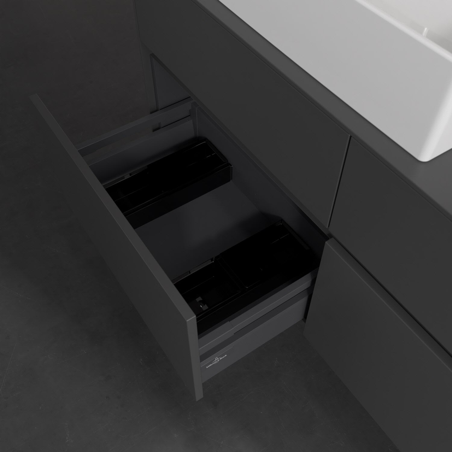 Stauraumwunder im zeitgemäßen Design: Der Villeroy & Boch Waschbeckenunterschrank aus der Collaro Kollektion eignet sich besonders für Familienbäder und bietet genau den Platz, der dort benötigt wird. Eine integrierte Griffleiste sorgt für eine schlichte, moderne Front. Steuern lässt sich das Licht über einen Touch-Sensor seitlich am Unterschrank. Im Inneren bietet das Möbelstück mit vier Auszügen erstaunlich viel Komfort – ermöglicht durch großzügiges Platzangebot und den integrierten Antirutschboden. Variabel setzbare Glasabtrennungen und mitgelieferte Accessory Boxen sorgen für den nötigen Überblick. Dank SoftClosing und Selbsteinzug lassen sich die Auszüge nach der Nutzung lautlos schließen. Die Front ist mit einer hochwertigen Lackierung versehen, deren Anti-Fingerprint-Oberfläche unschönen Fingerabdrücken vorbeugt.