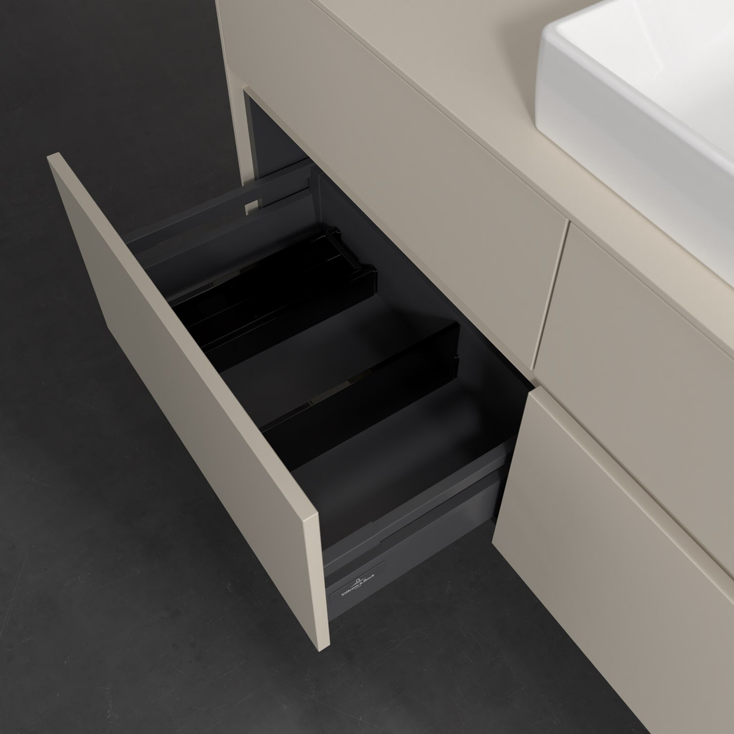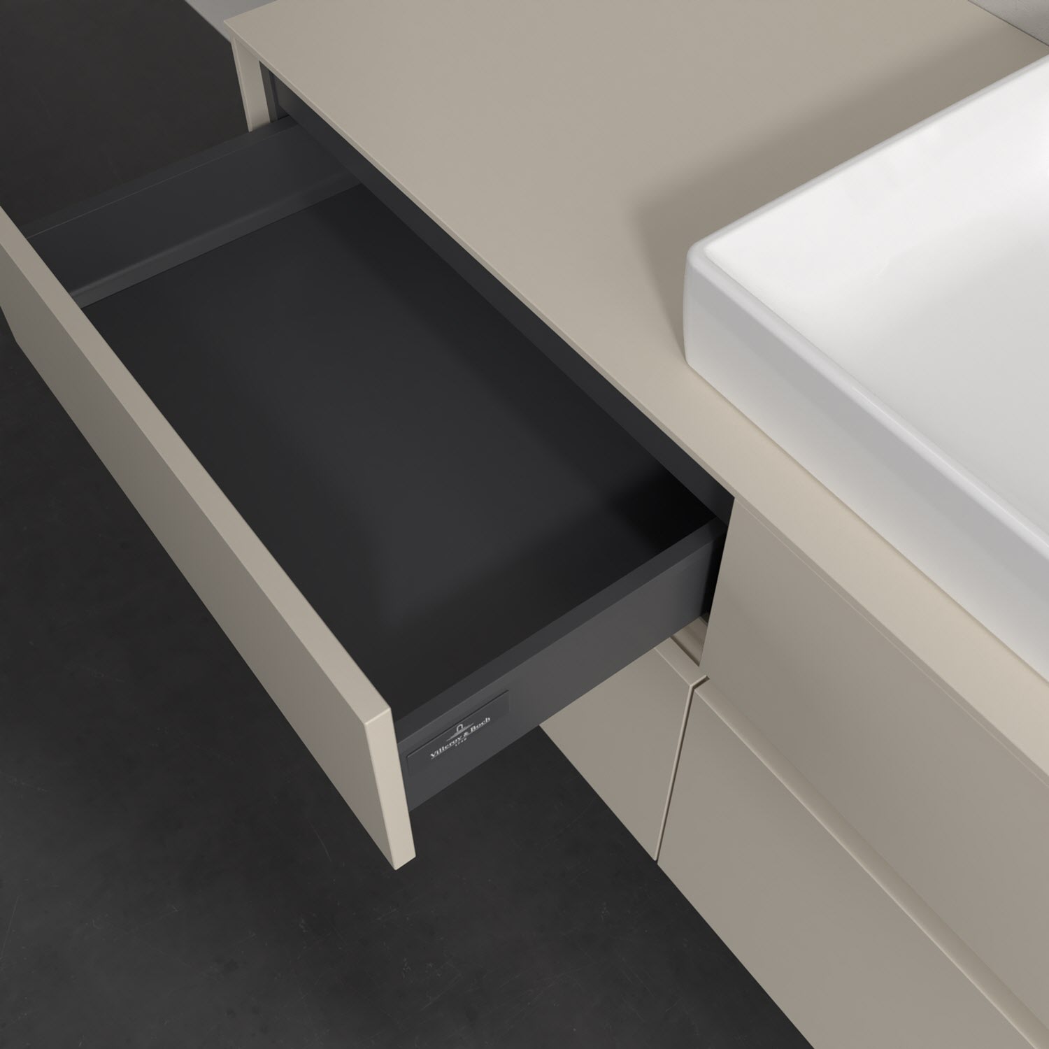 Stauraumwunder im zeitgemäßen Design: Der Villeroy & Boch Waschbeckenunterschrank aus der Collaro Kollektion eignet sich besonders für Familienbäder und bietet genau den Platz, der dort benötigt wird. Stimmungsvolles Highlight der schlichten, modernen Front ist die integrierte Griffmulde mit stufenlos einstellbarer LED-Beleuchtung. Im Inneren bietet das Möbelstück mit vier Auszügen erstaunlich viel Komfort – ermöglicht durch großzügiges Platzangebot und den integrierten Antirutschboden. Variabel setzbare Glasabtrennungen und mitgelieferte Accessory Boxen sorgen für den nötigen Überblick. Dank SoftClosing und Selbsteinzug lassen sich die Auszüge nach der Nutzung lautlos schließen. Die Front ist mit einer hochwertigen Lackierung versehen, deren Anti-Fingerprint-Oberfläche unschönen Fingerabdrücken vorbeugt.