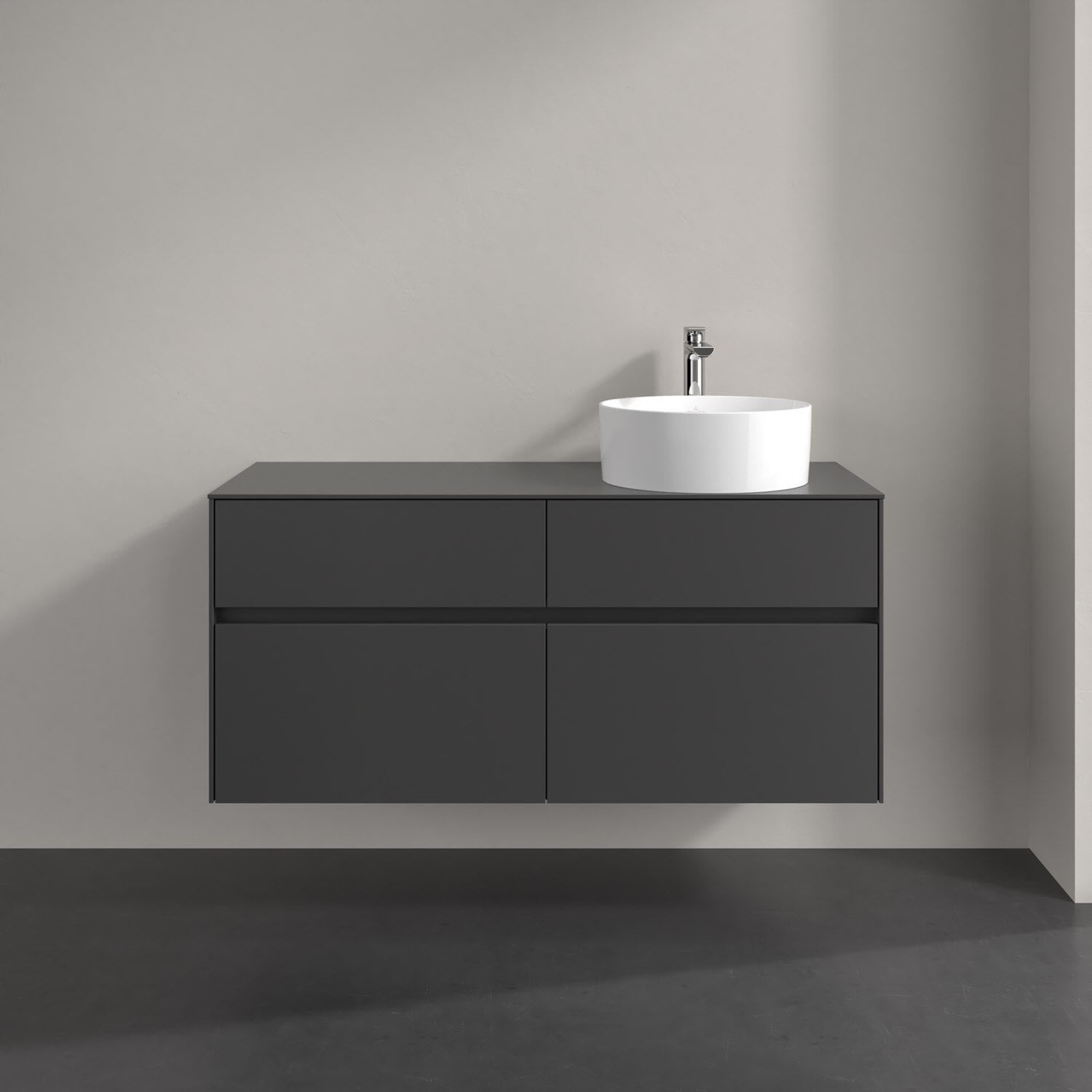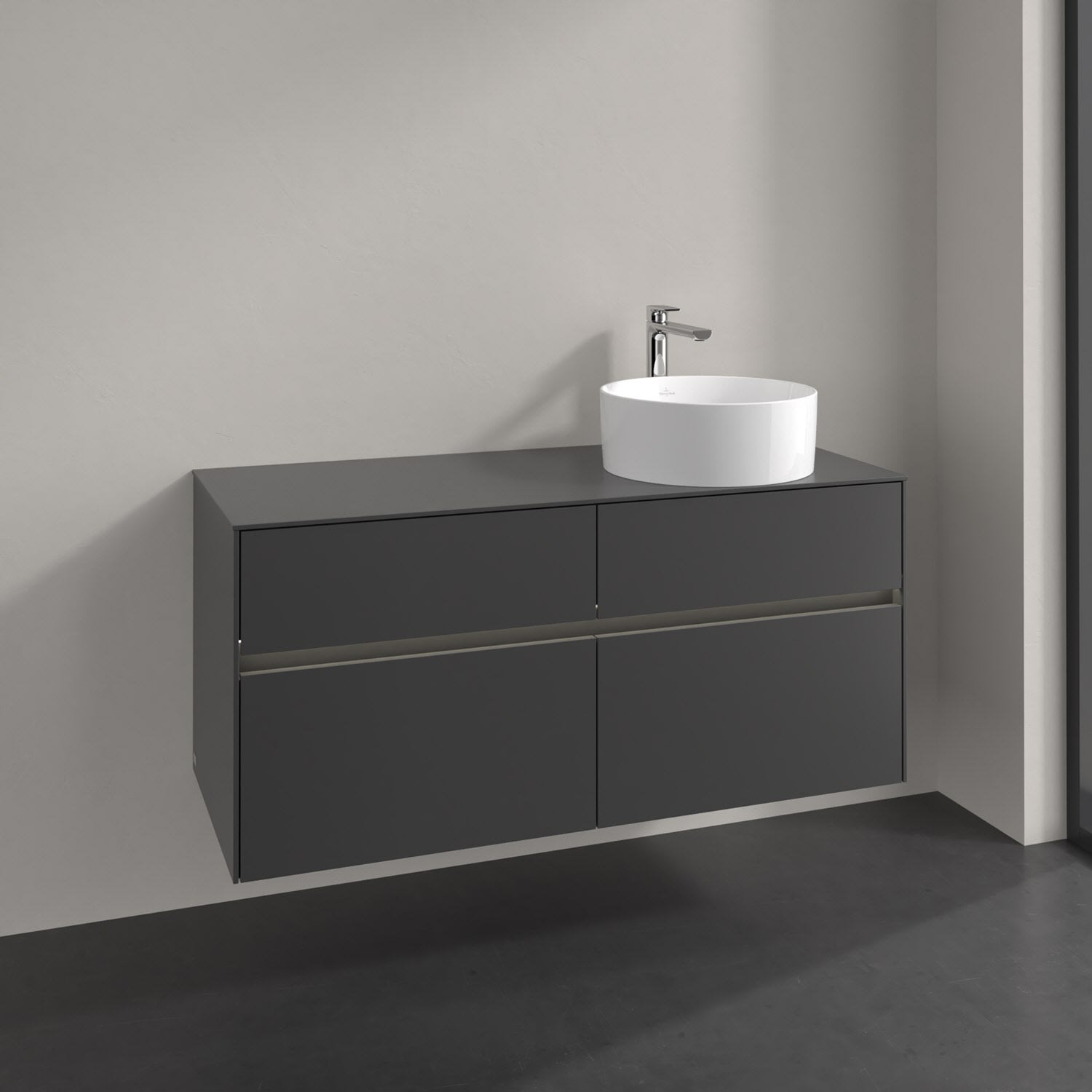 Stauraumwunder im zeitgemäßen Design: Der Villeroy & Boch Waschbeckenunterschrank aus der Collaro Kollektion eignet sich besonders für Familienbäder und bietet genau den Platz, der dort benötigt wird. Stimmungsvolles Highlight der schlichten, modernen Front ist die integrierte Griffmulde mit stufenlos einstellbarer LED-Beleuchtung. Steuern lässt sie sich über einen Touch-Sensor seitlich am Unterschrank. Im Inneren bietet das Möbelstück mit vier Auszügen erstaunlich viel Komfort – ermöglicht durch großzügiges Platzangebot und den integrierten Antirutschboden. Variabel setzbare Glasabtrennungen und mitgelieferte Accessory Boxen sorgen für den nötigen Überblick. Dank SoftClosing und Selbsteinzug lassen sich die Auszüge nach der Nutzung lautlos schließen. Die Front ist mit einer hochwertigen Lackierung versehen, deren Anti-Fingerprint-Oberfläche unschönen Fingerabdrücken vorbeugt.