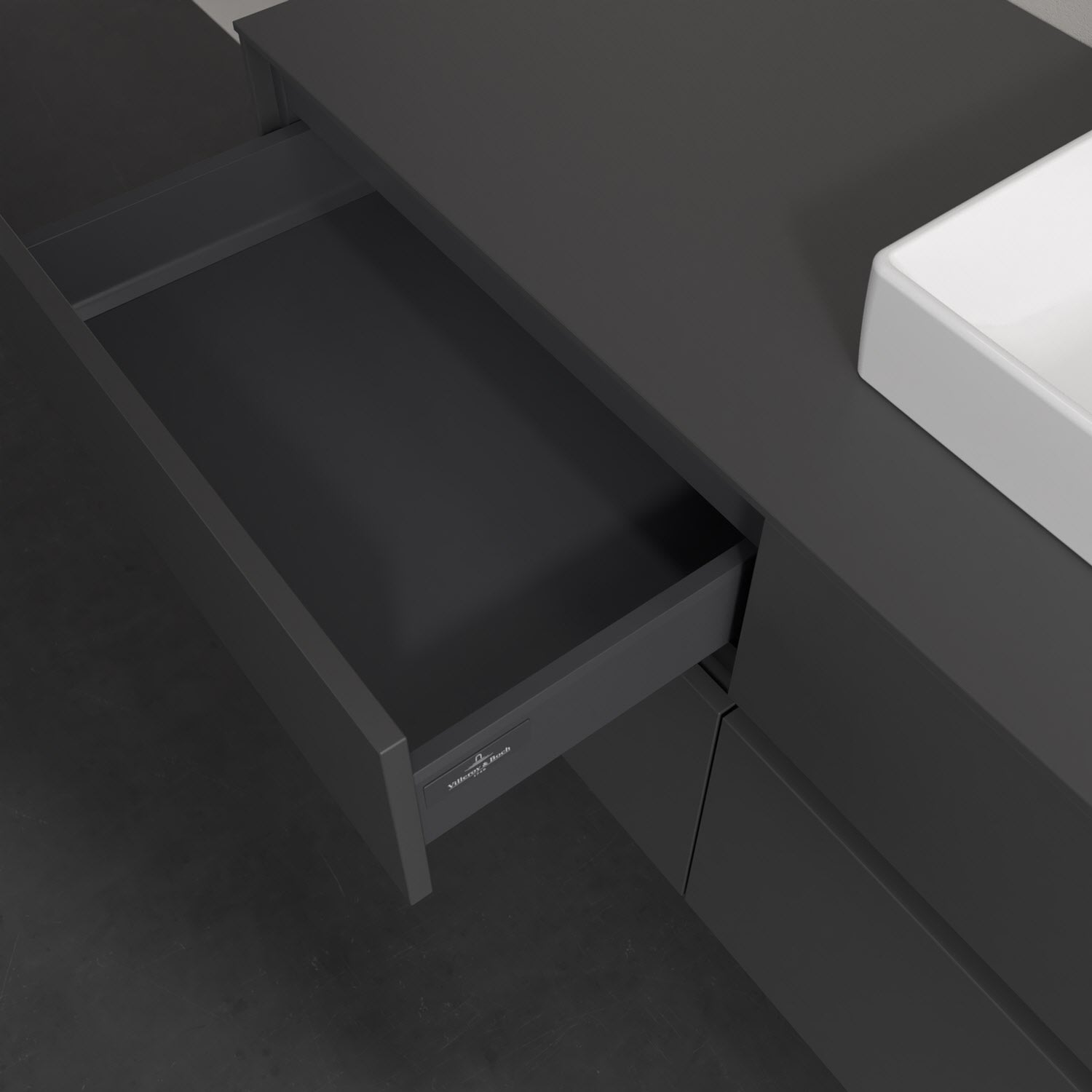 Stauraumwunder im zeitgemäßen Design: Der Villeroy & Boch Waschbeckenunterschrank aus der Collaro Kollektion eignet sich besonders für Familienbäder und bietet genau den Platz, der dort benötigt wird. Stimmungsvolles Highlight der schlichten, modernen Front ist die integrierte Griffmulde mit stufenlos einstellbarer LED-Beleuchtung. Im Inneren bietet das Möbelstück mit vier Auszügen erstaunlich viel Komfort – ermöglicht durch großzügiges Platzangebot und den integrierten Antirutschboden. Variabel setzbare Glasabtrennungen und mitgelieferte Accessory Boxen sorgen für den nötigen Überblick. Dank SoftClosing und Selbsteinzug lassen sich die Auszüge nach der Nutzung lautlos schließen. Die Front ist mit einer hochwertigen Lackierung versehen, deren Anti-Fingerprint-Oberfläche unschönen Fingerabdrücken vorbeugt.