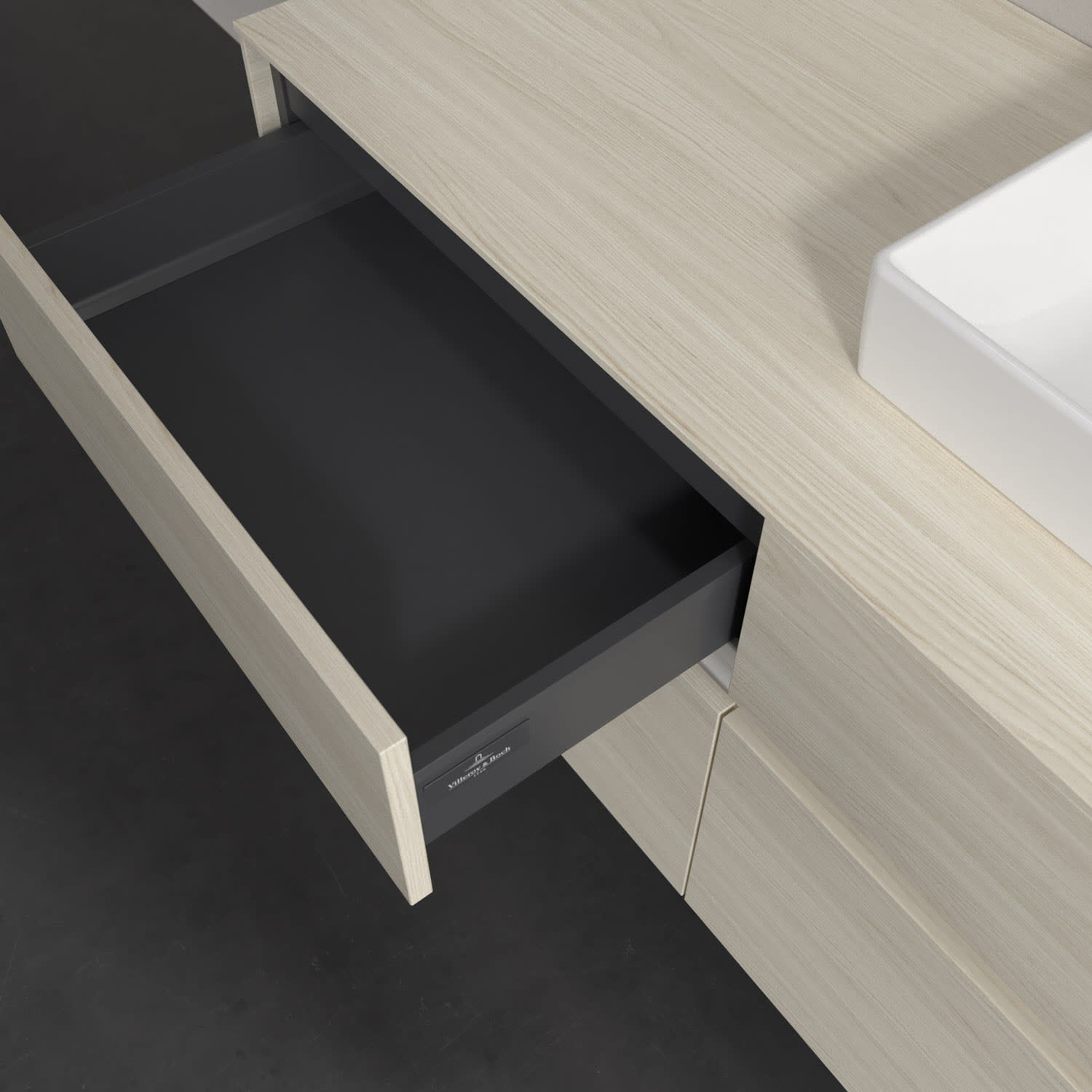 Stauraumwunder im zeitgemäßen Design: Der Villeroy & Boch Waschbeckenunterschrank aus der Collaro Kollektion eignet sich besonders für Familienbäder und bietet genau den Platz, der dort benötigt wird. Stimmungsvolles Highlight der schlichten, modernen Front ist die integrierte Griffmulde mit stufenlos einstellbarer LED-Beleuchtung. Im Inneren bietet das Möbelstück mit vier Auszügen erstaunlich viel Komfort – ermöglicht durch großzügiges Platzangebot und den integrierten Antirutschboden. Variabel setzbare Glasabtrennungen und mitgelieferte Accessory Boxen sorgen für den nötigen Überblick. Dank SoftClosing und Selbsteinzug lassen sich die Auszüge nach der Nutzung lautlos schließen. Für eine besonders leichte Reinigung sorgt die pflegeleichte Direktbeschichtung.