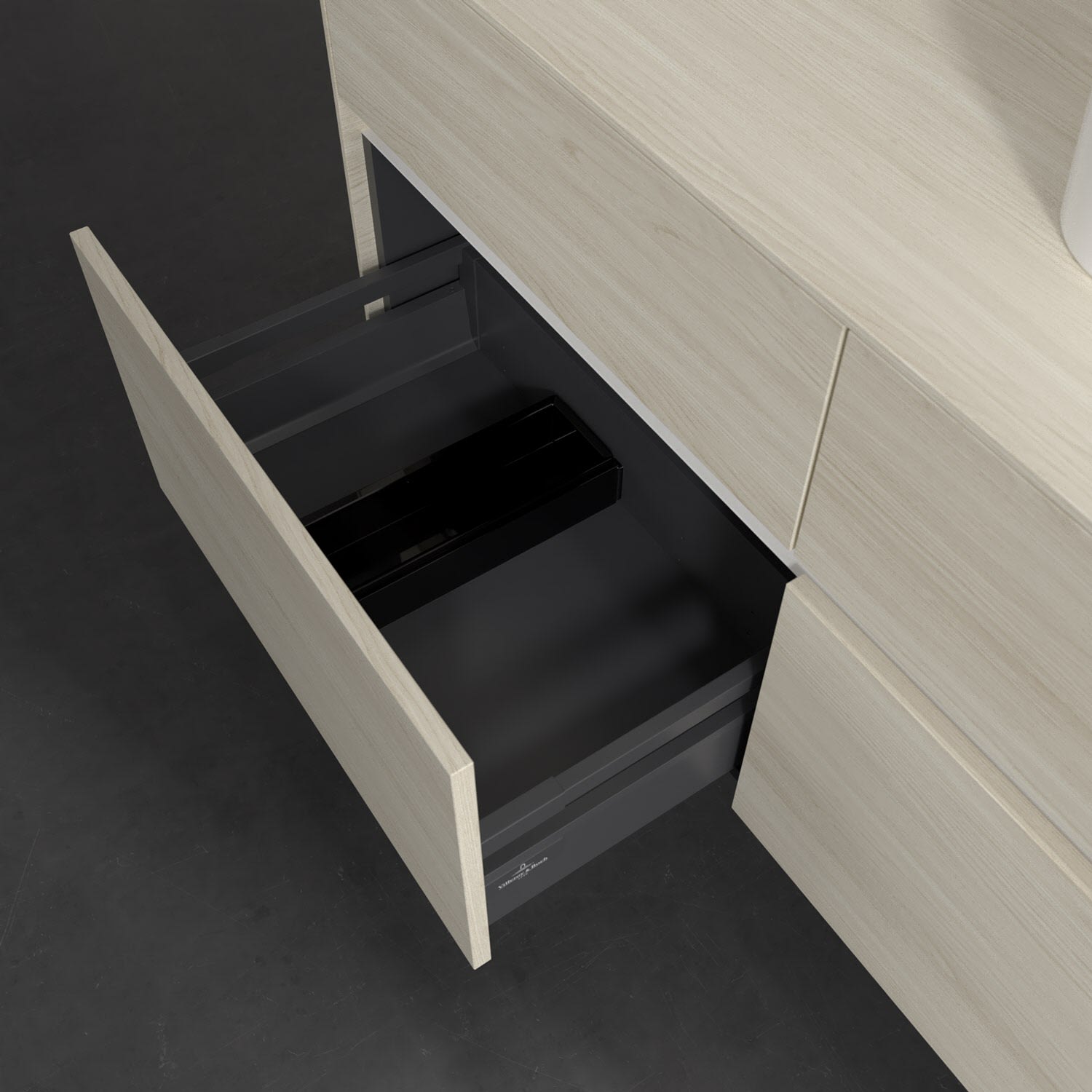 Stauraumwunder im zeitgemäßen Design: Der Villeroy & Boch Waschbeckenunterschrank aus der Collaro Kollektion eignet sich besonders für Familienbäder und bietet genau den Platz, der dort benötigt wird. Stimmungsvolles Highlight der schlichten, modernen Front ist die integrierte Griffmulde mit stufenlos einstellbarer LED-Beleuchtung. Im Inneren bietet das Möbelstück mit vier Auszügen erstaunlich viel Komfort – ermöglicht durch großzügiges Platzangebot und den integrierten Antirutschboden. Variabel setzbare Glasabtrennungen und mitgelieferte Accessory Boxen sorgen für den nötigen Überblick. Dank SoftClosing und Selbsteinzug lassen sich die Auszüge nach der Nutzung lautlos schließen. Für eine besonders leichte Reinigung sorgt die pflegeleichte Direktbeschichtung.