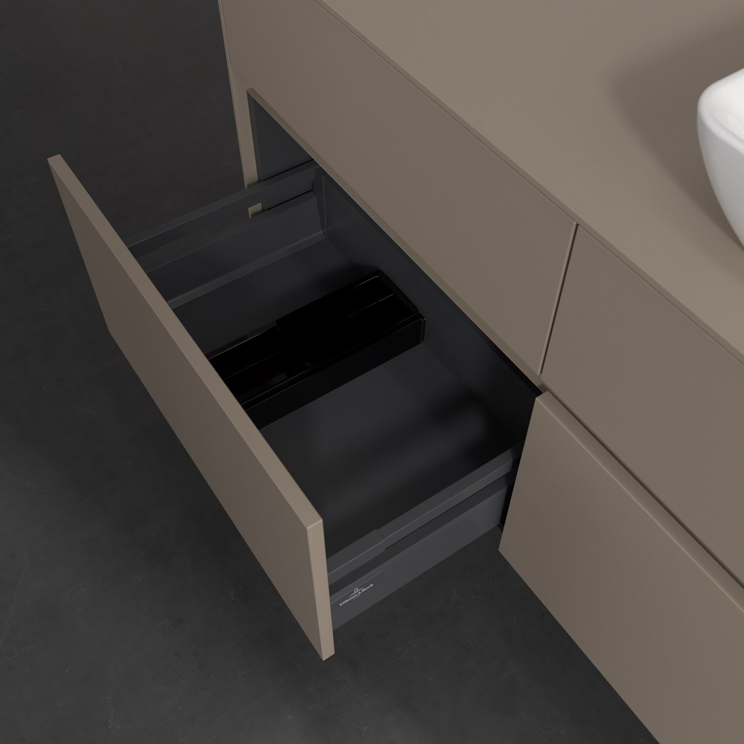 Stauraumwunder im zeitgemäßen Design: Der Villeroy & Boch Waschbeckenunterschrank aus der Collaro Kollektion eignet sich besonders für Familienbäder und bietet genau den Platz, der dort benötigt wird. Stimmungsvolles Highlight der schlichten, modernen Front ist die integrierte Griffmulde mit stufenlos einstellbarer LED-Beleuchtung. Im Inneren bietet das Möbelstück mit vier Auszügen erstaunlich viel Komfort – ermöglicht durch großzügiges Platzangebot und den integrierten Antirutschboden. Variabel setzbare Glasabtrennungen und mitgelieferte Accessory Boxen sorgen für den nötigen Überblick. Dank SoftClosing und Selbsteinzug lassen sich die Auszüge nach der Nutzung lautlos schließen. Die Front ist mit einer hochwertigen Lackierung versehen, deren Anti-Fingerprint-Oberfläche unschönen Fingerabdrücken vorbeugt.