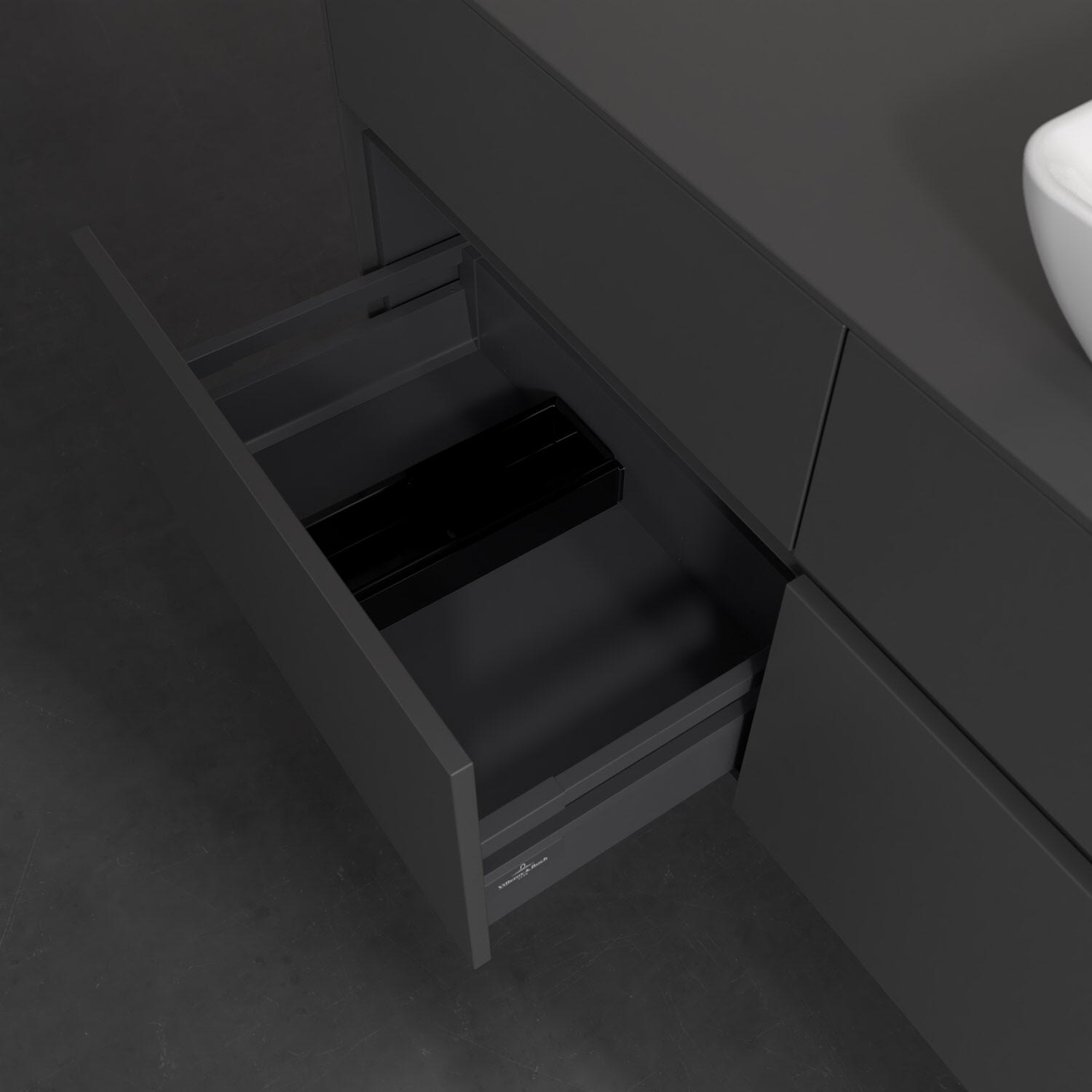 Stauraumwunder im zeitgemäßen Design: Der Villeroy & Boch Waschbeckenunterschrank aus der Collaro Kollektion eignet sich besonders für Familienbäder und bietet genau den Platz, der dort benötigt wird. Stimmungsvolles Highlight der schlichten, modernen Front ist die integrierte Griffmulde mit stufenlos einstellbarer LED-Beleuchtung. Im Inneren bietet das Möbelstück mit vier Auszügen erstaunlich viel Komfort – ermöglicht durch großzügiges Platzangebot und den integrierten Antirutschboden. Variabel setzbare Glasabtrennungen und mitgelieferte Accessory Boxen sorgen für den nötigen Überblick. Dank SoftClosing und Selbsteinzug lassen sich die Auszüge nach der Nutzung lautlos schließen. Die Front ist mit einer hochwertigen Lackierung versehen, deren Anti-Fingerprint-Oberfläche unschönen Fingerabdrücken vorbeugt.