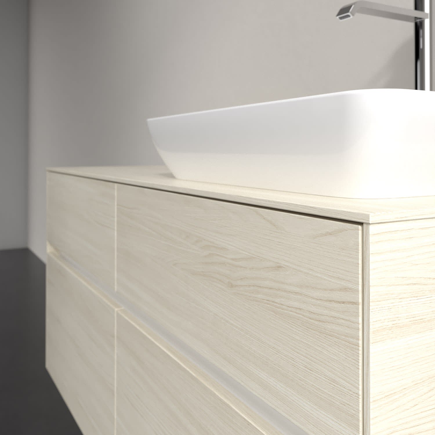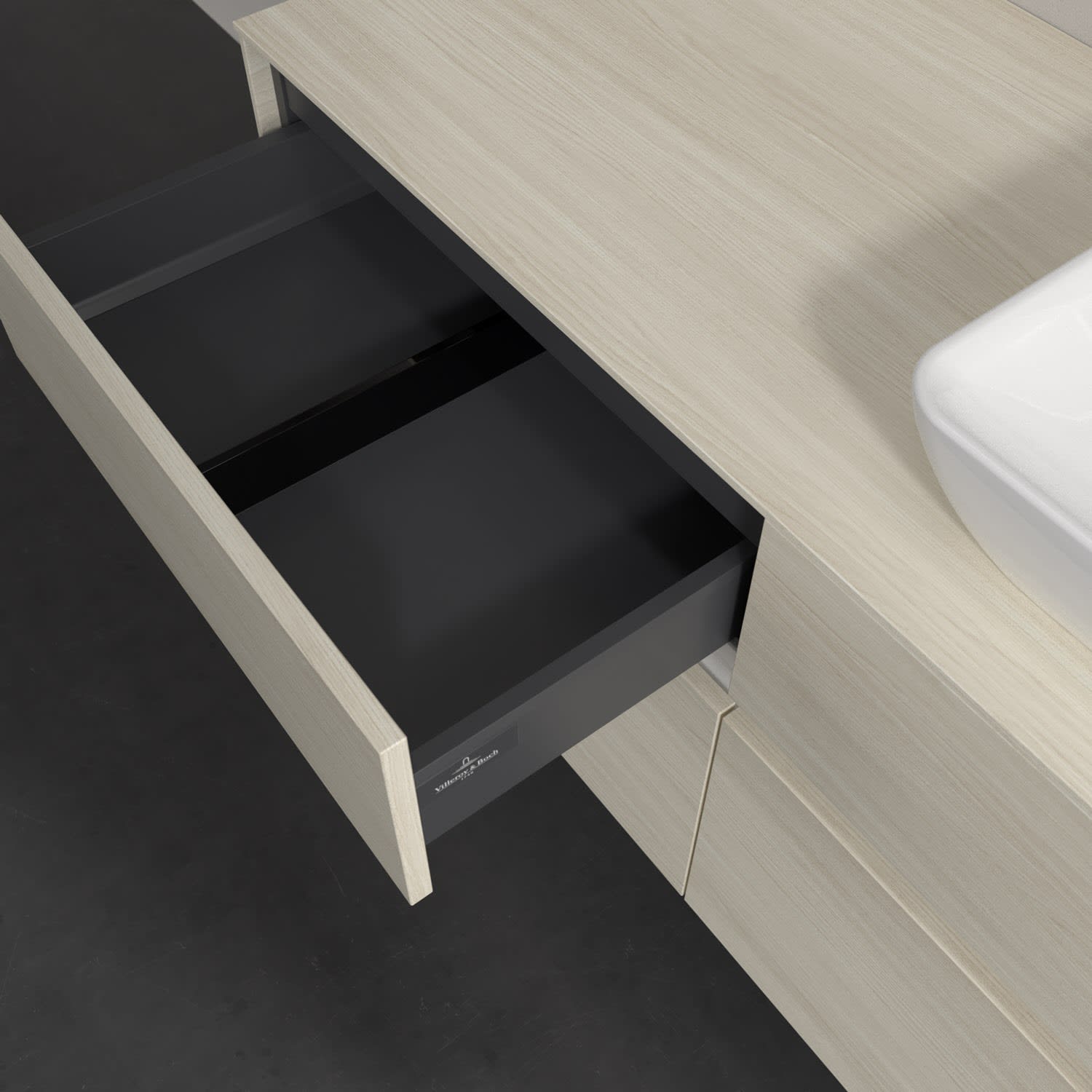 Stauraumwunder im zeitgemäßen Design: Der Villeroy & Boch Waschbeckenunterschrank aus der Collaro Kollektion eignet sich besonders für Familienbäder und bietet genau den Platz, der dort benötigt wird. Stimmungsvolles Highlight der schlichten, modernen Front ist die integrierte Griffmulde mit stufenlos einstellbarer LED-Beleuchtung. Im Inneren bietet das Möbelstück mit vier Auszügen erstaunlich viel Komfort – ermöglicht durch großzügiges Platzangebot und den integrierten Antirutschboden. Variabel setzbare Glasabtrennungen und mitgelieferte Accessory Boxen sorgen für den nötigen Überblick. Dank SoftClosing und Selbsteinzug lassen sich die Auszüge nach der Nutzung lautlos schließen. Für eine besonders leichte Reinigung sorgt die pflegeleichte Direktbeschichtung.