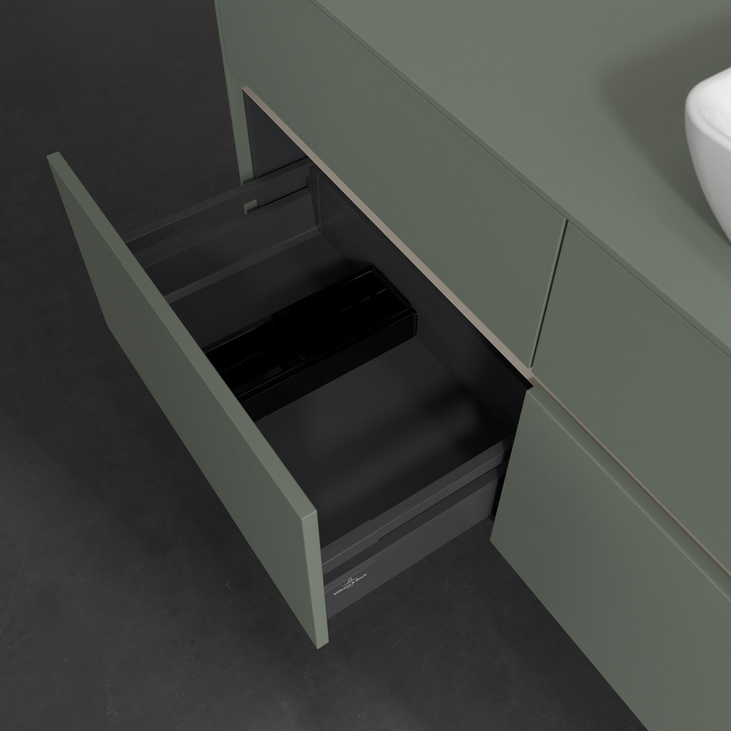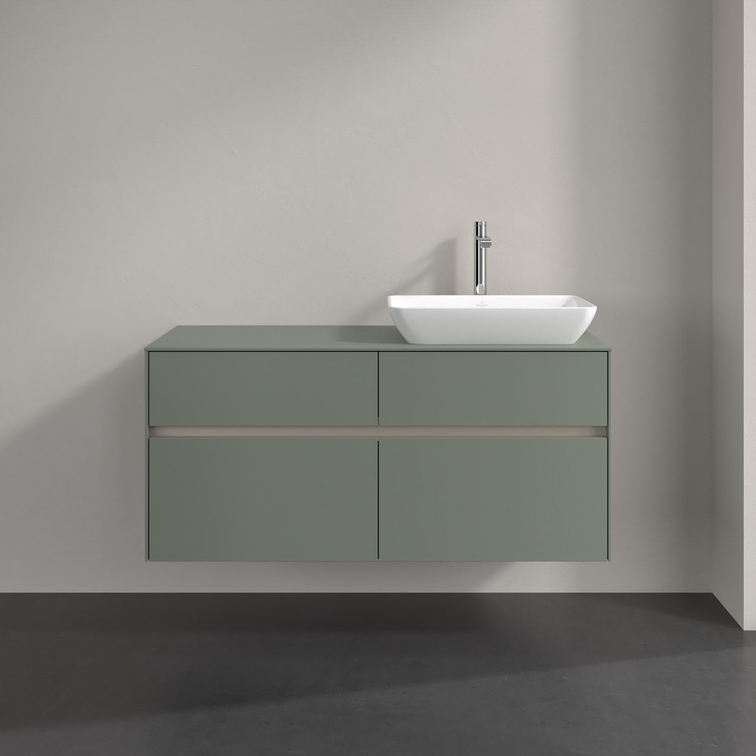 Stauraumwunder im zeitgemäßen Design: Der Villeroy & Boch Waschbeckenunterschrank aus der Collaro Kollektion eignet sich besonders für Familienbäder und bietet genau den Platz, der dort benötigt wird. Stimmungsvolles Highlight der schlichten, modernen Front ist die integrierte Griffmulde mit stufenlos einstellbarer LED-Beleuchtung. Im Inneren bietet das Möbelstück mit vier Auszügen erstaunlich viel Komfort – ermöglicht durch großzügiges Platzangebot und den integrierten Antirutschboden. Variabel setzbare Glasabtrennungen und mitgelieferte Accessory Boxen sorgen für den nötigen Überblick. Dank SoftClosing und Selbsteinzug lassen sich die Auszüge nach der Nutzung lautlos schließen. Die Front ist mit einer hochwertigen Lackierung versehen, deren Anti-Fingerprint-Oberfläche unschönen Fingerabdrücken vorbeugt.