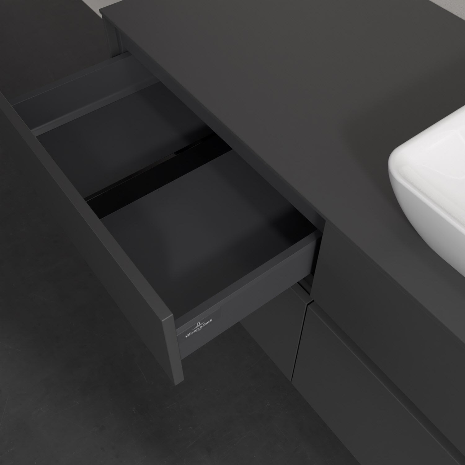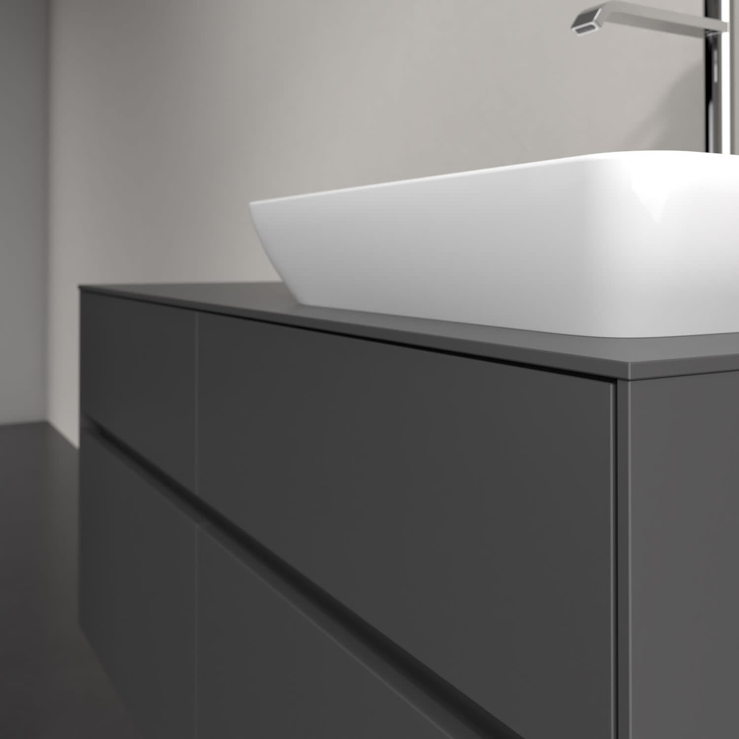 Stauraumwunder im zeitgemäßen Design: Der Villeroy & Boch Waschbeckenunterschrank aus der Collaro Kollektion eignet sich besonders für Familienbäder und bietet genau den Platz, der dort benötigt wird. Eine integrierte Griffleiste sorgt für eine schlichte, moderne Front. Steuern lässt sich das Licht über einen Touch-Sensor seitlich am Unterschrank. Im Inneren bietet das Möbelstück mit vier Auszügen erstaunlich viel Komfort – ermöglicht durch großzügiges Platzangebot und den integrierten Antirutschboden. Variabel setzbare Glasabtrennungen und mitgelieferte Accessory Boxen sorgen für den nötigen Überblick. Dank SoftClosing und Selbsteinzug lassen sich die Auszüge nach der Nutzung lautlos schließen. Die Front ist mit einer hochwertigen Lackierung versehen, deren Anti-Fingerprint-Oberfläche unschönen Fingerabdrücken vorbeugt.