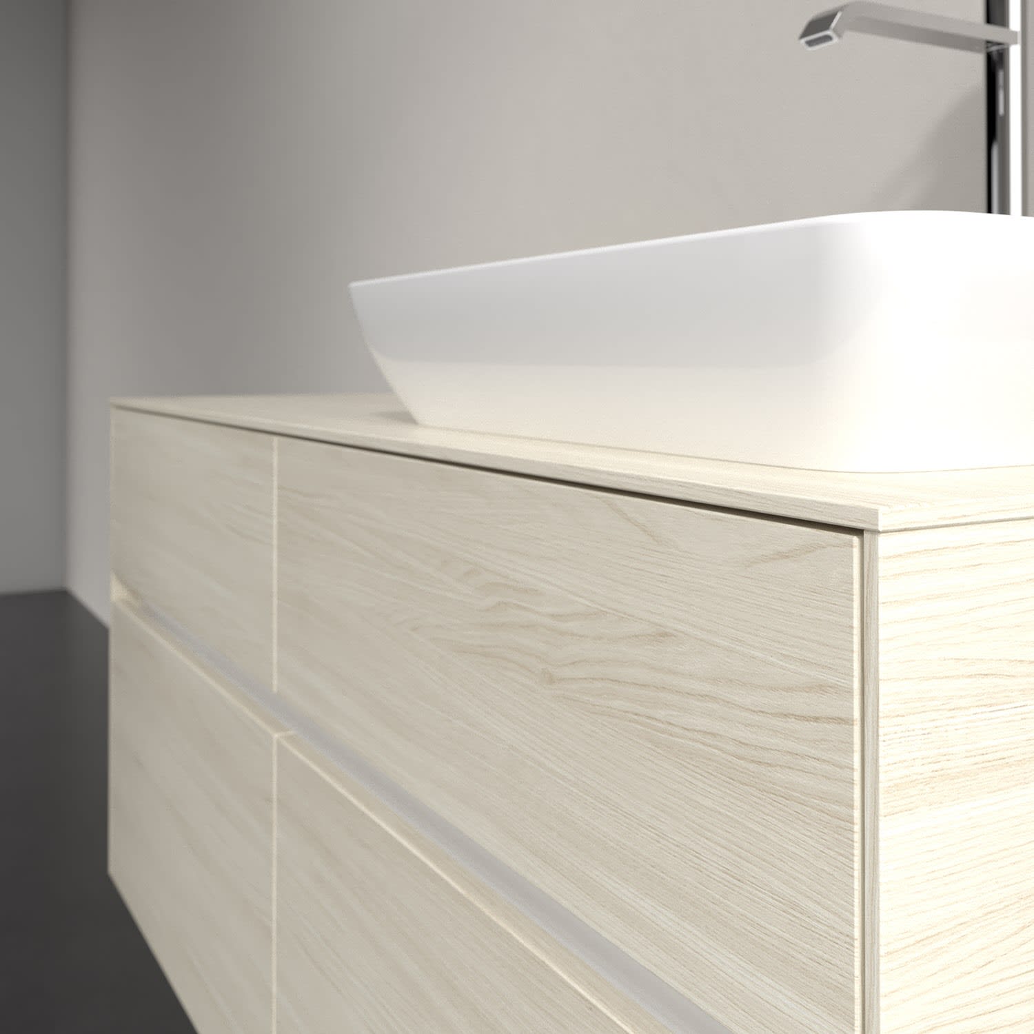 Stauraumwunder im zeitgemäßen Design: Der Villeroy & Boch Waschbeckenunterschrank aus der Collaro Kollektion eignet sich besonders für Familienbäder und bietet genau den Platz, der dort benötigt wird. Eine integrierte Griffleiste sorgt für eine schlichte, moderne Front. Steuern lässt sich das Licht über einen Touch-Sensor seitlich am Unterschrank. Im Inneren bietet das Möbelstück mit vier Auszügen erstaunlich viel Komfort – ermöglicht durch großzügiges Platzangebot und den integrierten Antirutschboden. Variabel setzbare Glasabtrennungen und mitgelieferte Accessory Boxen sorgen für den nötigen Überblick. Dank SoftClosing und Selbsteinzug lassen sich die Auszüge nach der Nutzung lautlos schließen. Für eine besonders leichte Reinigung sorgt die pflegeleichte Direktbeschichtung.