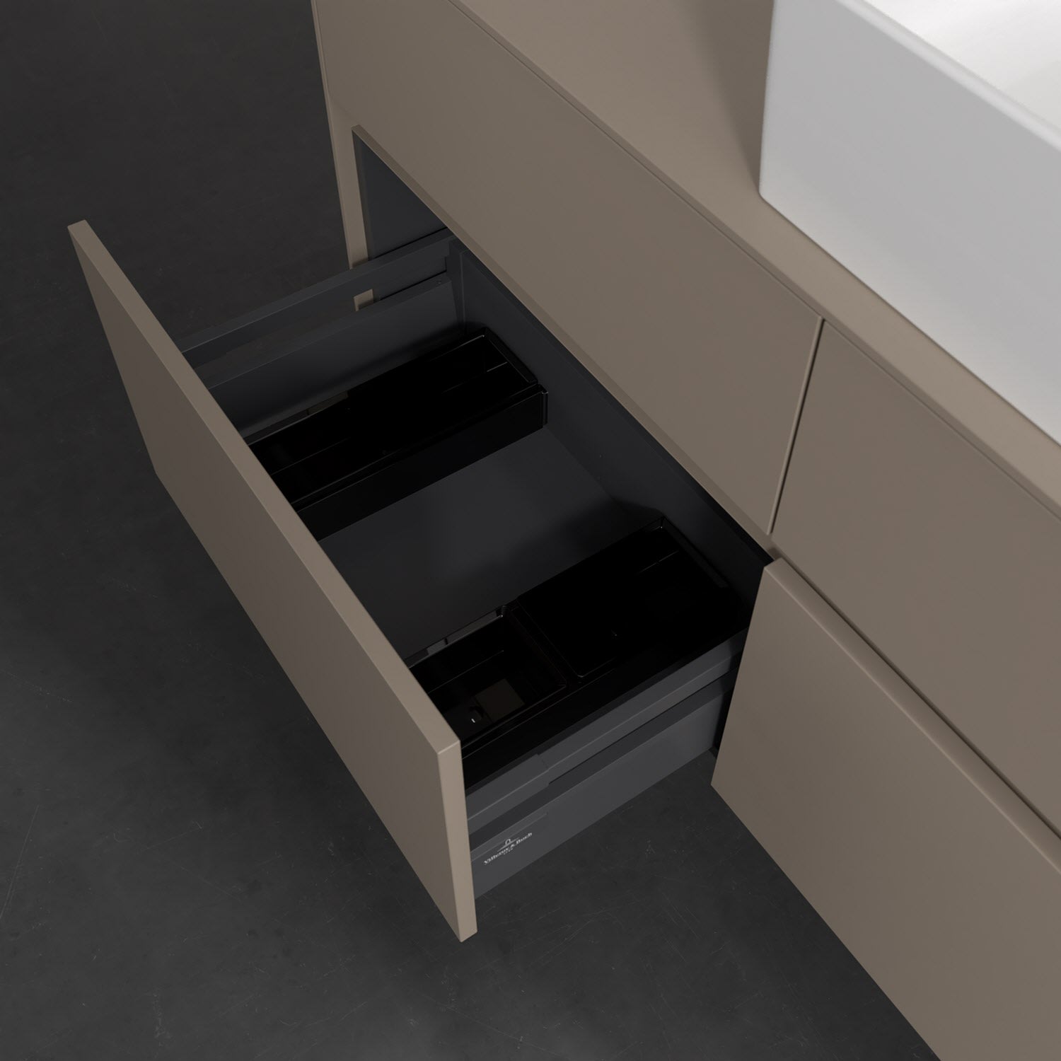 Stauraumwunder im zeitgemäßen Design: Der Villeroy & Boch Waschbeckenunterschrank aus der Collaro Kollektion eignet sich besonders für Familienbäder und bietet genau den Platz, der dort benötigt wird. Stimmungsvolles Highlight der schlichten, modernen Front ist die integrierte Griffmulde mit stufenlos einstellbarer LED-Beleuchtung. Im Inneren bietet das Möbelstück mit vier Auszügen erstaunlich viel Komfort – ermöglicht durch großzügiges Platzangebot und den integrierten Antirutschboden. Variabel setzbare Glasabtrennungen und mitgelieferte Accessory Boxen sorgen für den nötigen Überblick. Dank SoftClosing und Selbsteinzug lassen sich die Auszüge nach der Nutzung lautlos schließen. Die Front ist mit einer hochwertigen Lackierung versehen, deren Anti-Fingerprint-Oberfläche unschönen Fingerabdrücken vorbeugt.