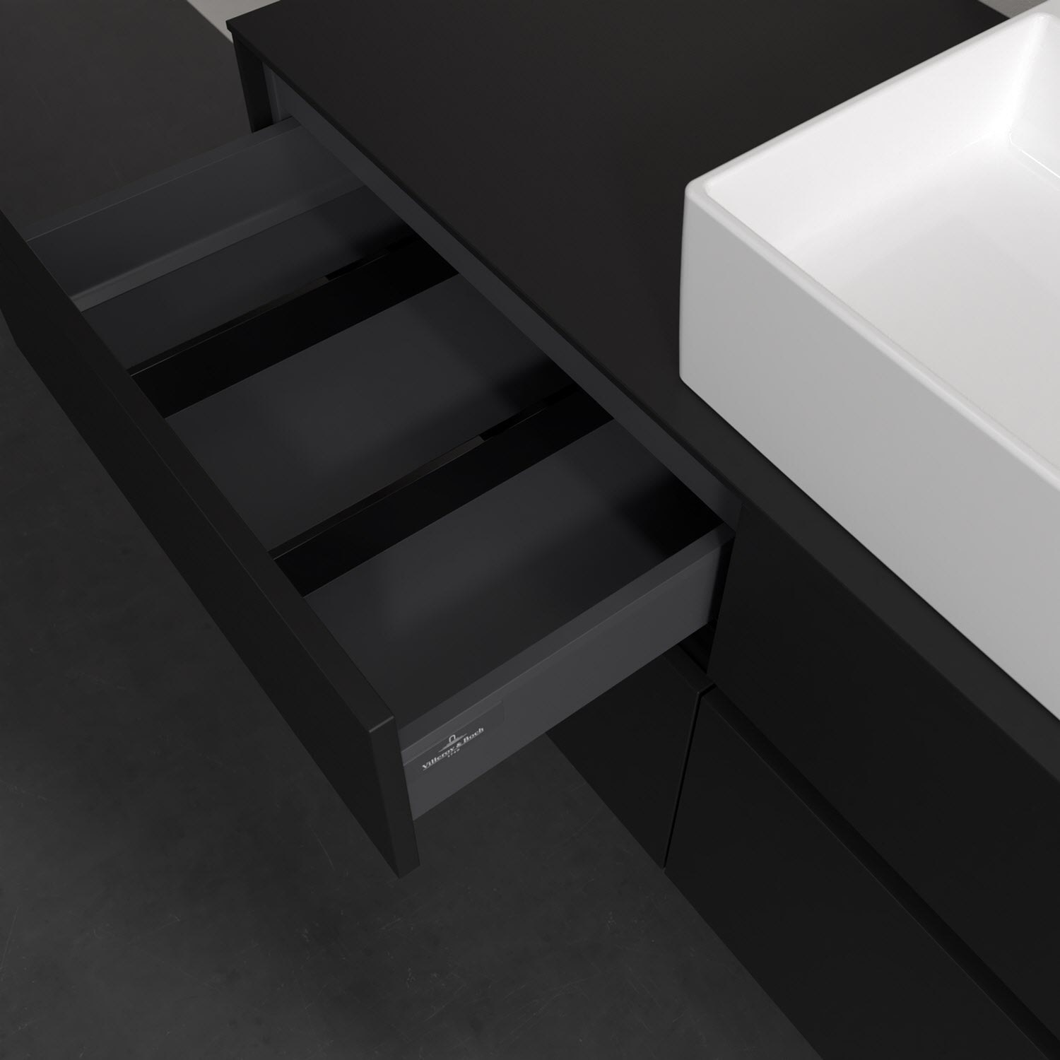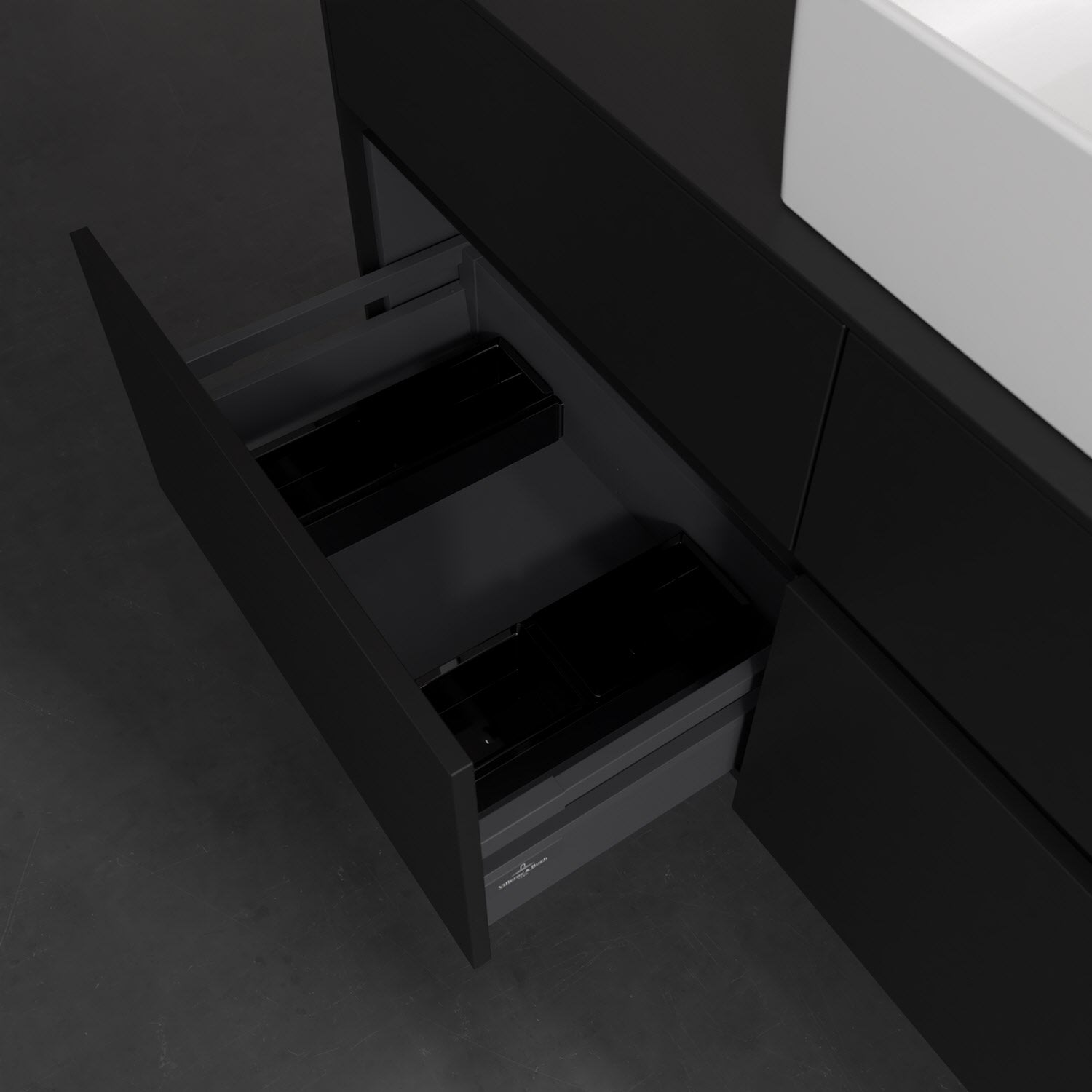 Stauraumwunder im zeitgemäßen Design: Der Villeroy & Boch Waschbeckenunterschrank aus der Collaro Kollektion eignet sich besonders für Familienbäder und bietet genau den Platz, der dort benötigt wird. Stimmungsvolles Highlight der schlichten, modernen Front ist die integrierte Griffmulde mit stufenlos einstellbarer LED-Beleuchtung. Im Inneren bietet das Möbelstück mit vier Auszügen erstaunlich viel Komfort – ermöglicht durch großzügiges Platzangebot und den integrierten Antirutschboden. Variabel setzbare Glasabtrennungen und mitgelieferte Accessory Boxen sorgen für den nötigen Überblick. Dank SoftClosing und Selbsteinzug lassen sich die Auszüge nach der Nutzung lautlos schließen. Die Front ist mit einer hochwertigen Lackierung versehen, deren Anti-Fingerprint-Oberfläche unschönen Fingerabdrücken vorbeugt.