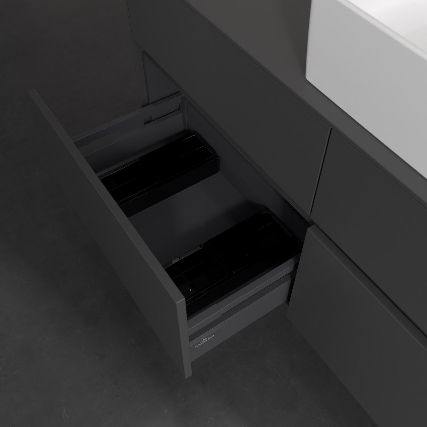 Stauraumwunder im zeitgemäßen Design: Der Villeroy & Boch Waschbeckenunterschrank aus der Collaro Kollektion eignet sich besonders für Familienbäder und bietet genau den Platz, der dort benötigt wird. Eine integrierte Griffleiste sorgt für eine schlichte, moderne Front. Steuern lässt sich das Licht über einen Touch-Sensor seitlich am Unterschrank. Im Inneren bietet das Möbelstück mit vier Auszügen erstaunlich viel Komfort – ermöglicht durch großzügiges Platzangebot und den integrierten Antirutschboden. Variabel setzbare Glasabtrennungen und mitgelieferte Accessory Boxen sorgen für den nötigen Überblick. Dank SoftClosing und Selbsteinzug lassen sich die Auszüge nach der Nutzung lautlos schließen. Die Front ist mit einer hochwertigen Lackierung versehen, deren Anti-Fingerprint-Oberfläche unschönen Fingerabdrücken vorbeugt.