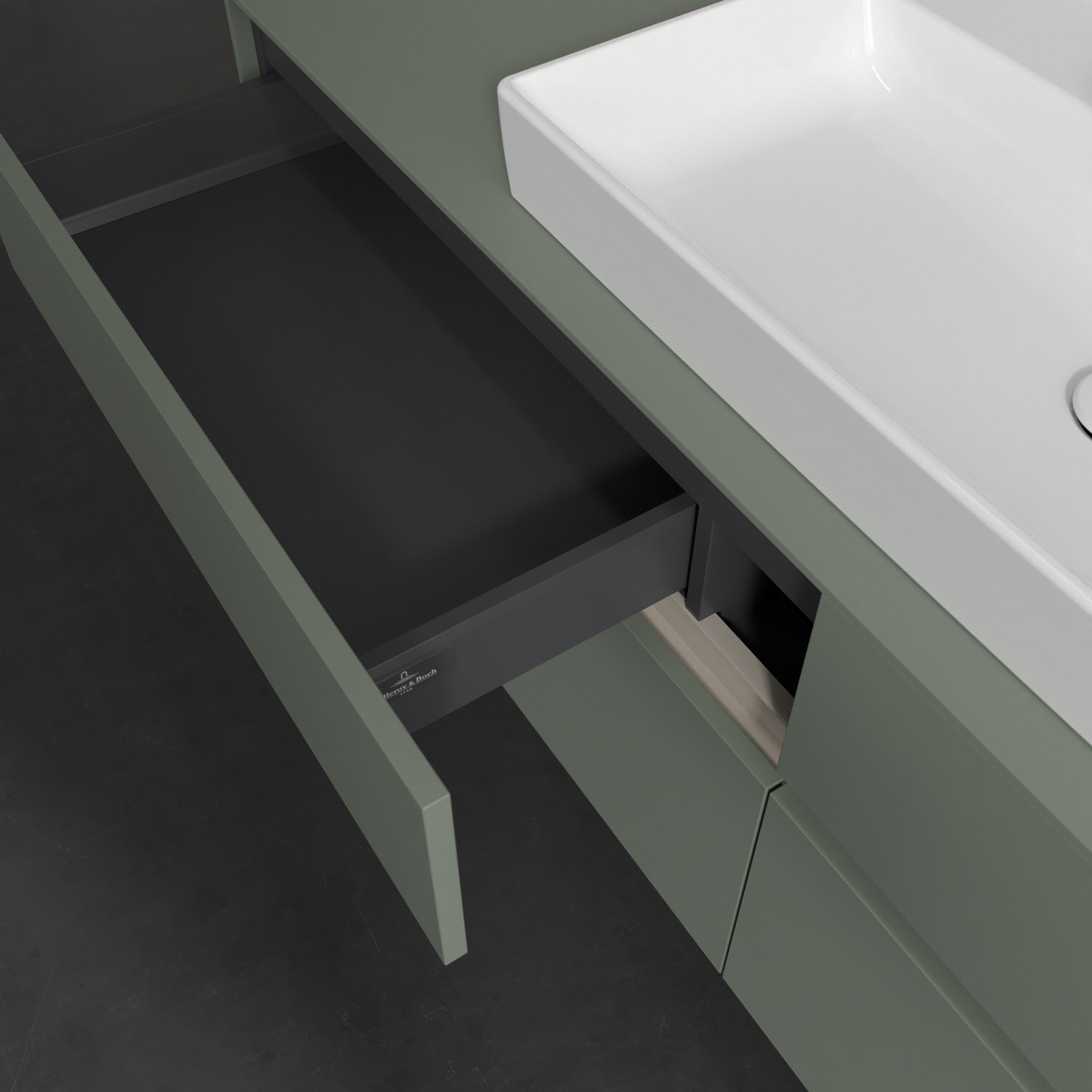 Stauraumwunder im zeitgemäßen Design: Der Villeroy & Boch Waschbeckenunterschrank aus der Collaro Kollektion eignet sich besonders für Familienbäder und bietet genau den Platz, der dort benötigt wird. Stimmungsvolles Highlight der schlichten, modernen Front ist die integrierte Griffmulde mit stufenlos einstellbarer LED-Beleuchtung. Steuern lässt sie sich über einen Touch-Sensor seitlich am Unterschrank. Im Inneren bietet das Möbelstück mit vier Auszügen erstaunlich viel Komfort – ermöglicht durch großzügiges Platzangebot und den integrierten Antirutschboden. Variabel setzbare Glasabtrennungen und mitgelieferte Accessory Boxen sorgen für den nötigen Überblick. Dank SoftClosing und Selbsteinzug lassen sich die Auszüge nach der Nutzung lautlos schließen. Die Front ist mit einer hochwertigen Lackierung versehen, deren Anti-Fingerprint-Oberfläche unschönen Fingerabdrücken vorbeugt.