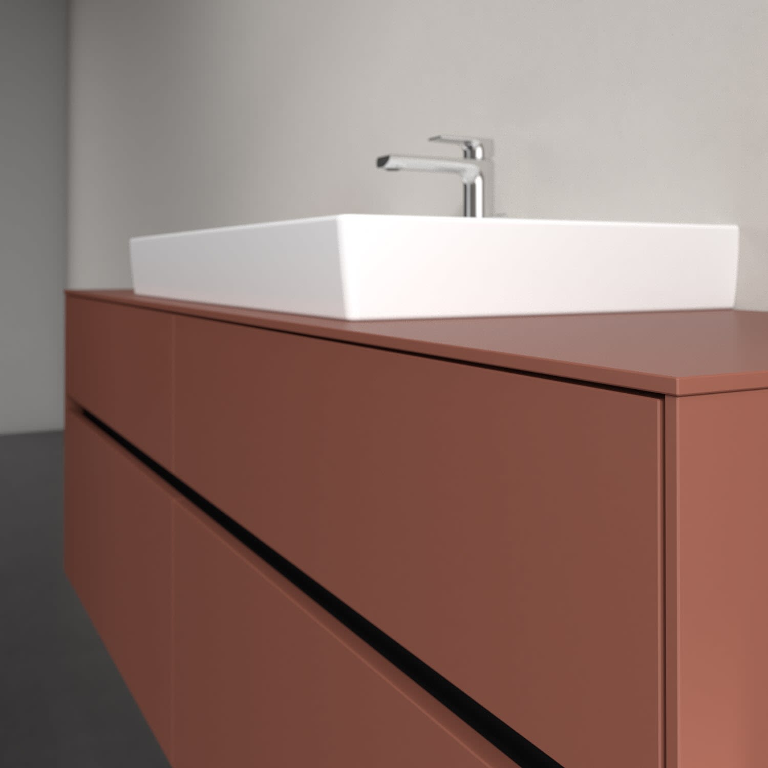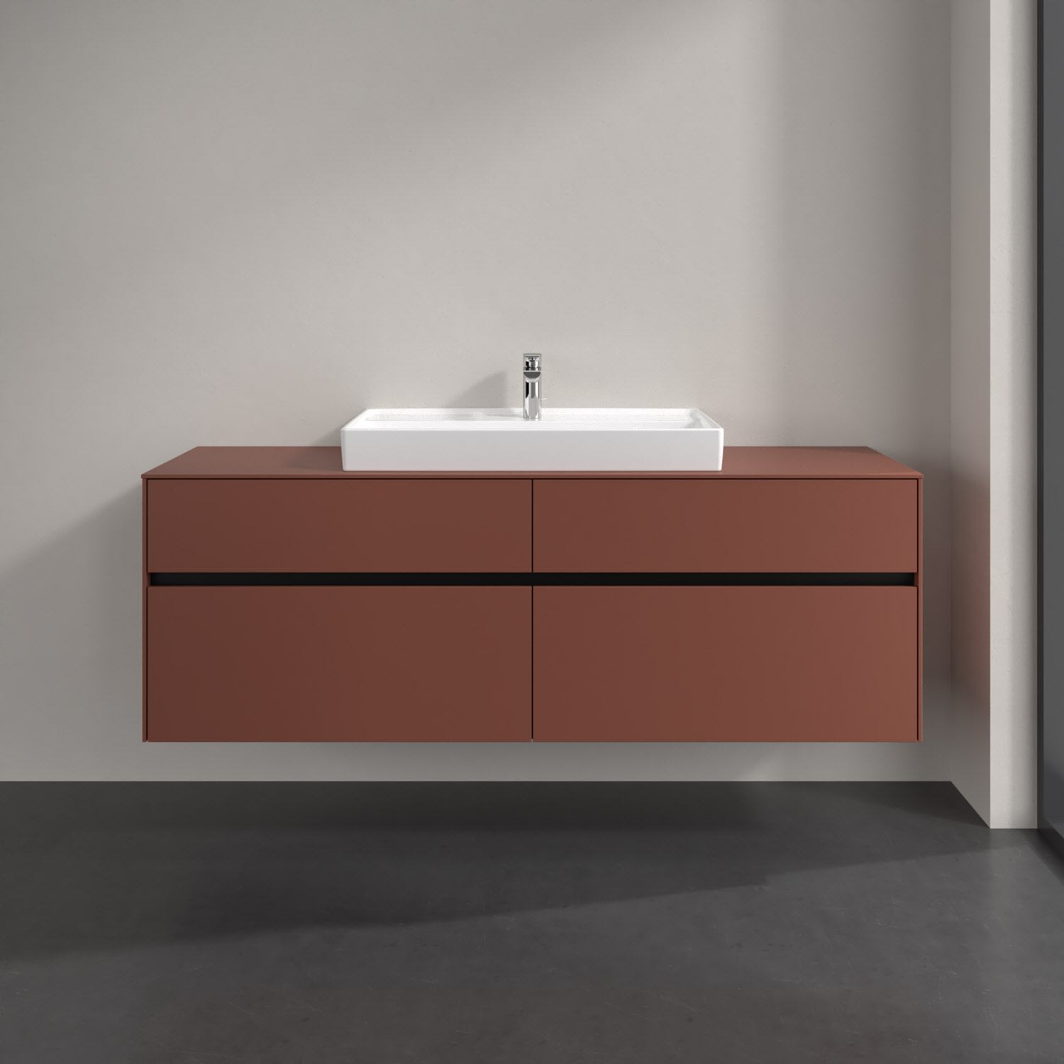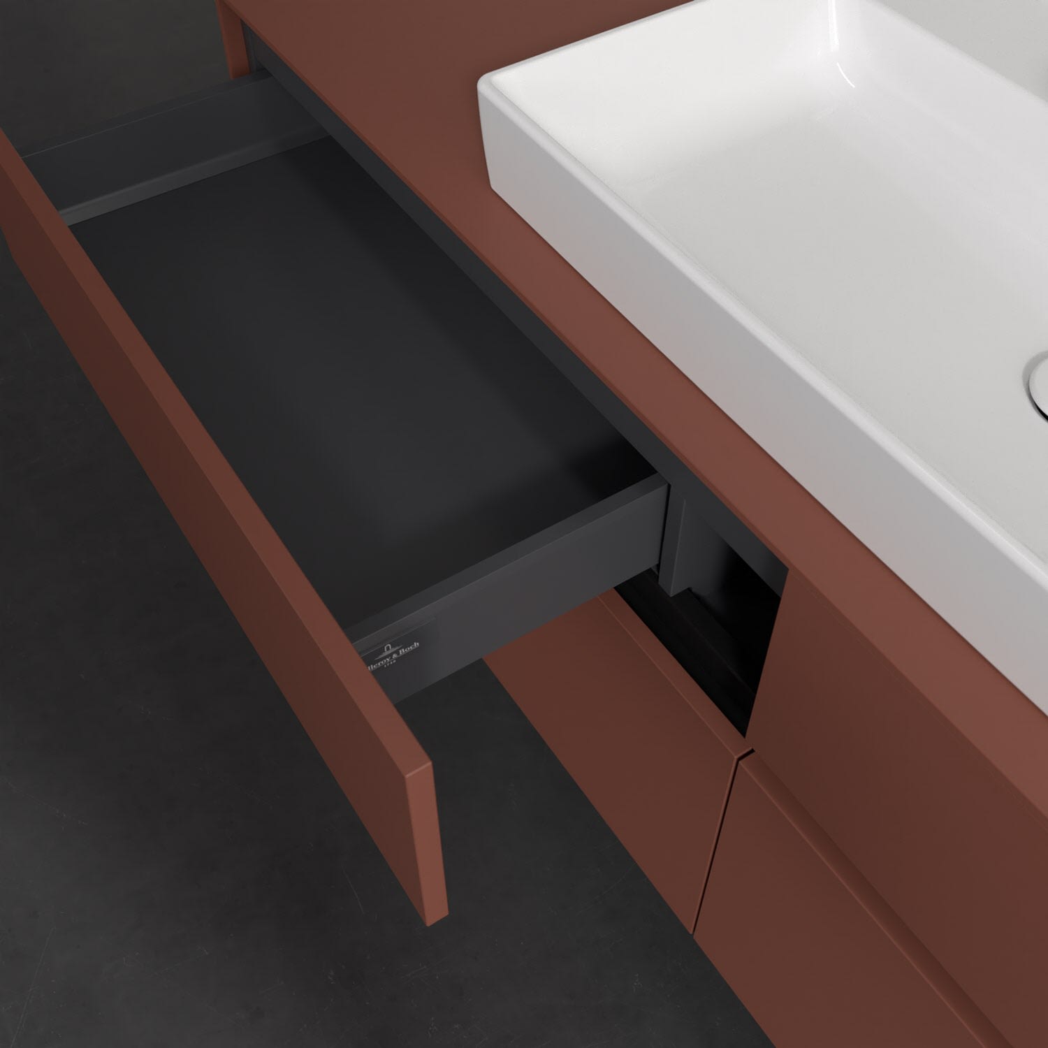 Stauraumwunder im zeitgemäßen Design: Der Villeroy & Boch Waschbeckenunterschrank aus der Collaro Kollektion eignet sich besonders für Familienbäder und bietet genau den Platz, der dort benötigt wird. Stimmungsvolles Highlight der schlichten, modernen Front ist die integrierte Griffmulde mit stufenlos einstellbarer LED-Beleuchtung. Steuern lässt sie sich über einen Touch-Sensor seitlich am Unterschrank. Im Inneren bietet das Möbelstück mit vier Auszügen erstaunlich viel Komfort – ermöglicht durch großzügiges Platzangebot und den integrierten Antirutschboden. Variabel setzbare Glasabtrennungen und mitgelieferte Accessory Boxen sorgen für den nötigen Überblick. Dank SoftClosing und Selbsteinzug lassen sich die Auszüge nach der Nutzung lautlos schließen. Die Front ist mit einer hochwertigen Lackierung versehen, deren Anti-Fingerprint-Oberfläche unschönen Fingerabdrücken vorbeugt.