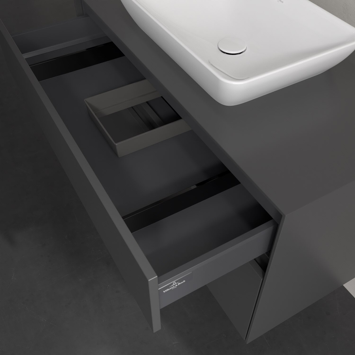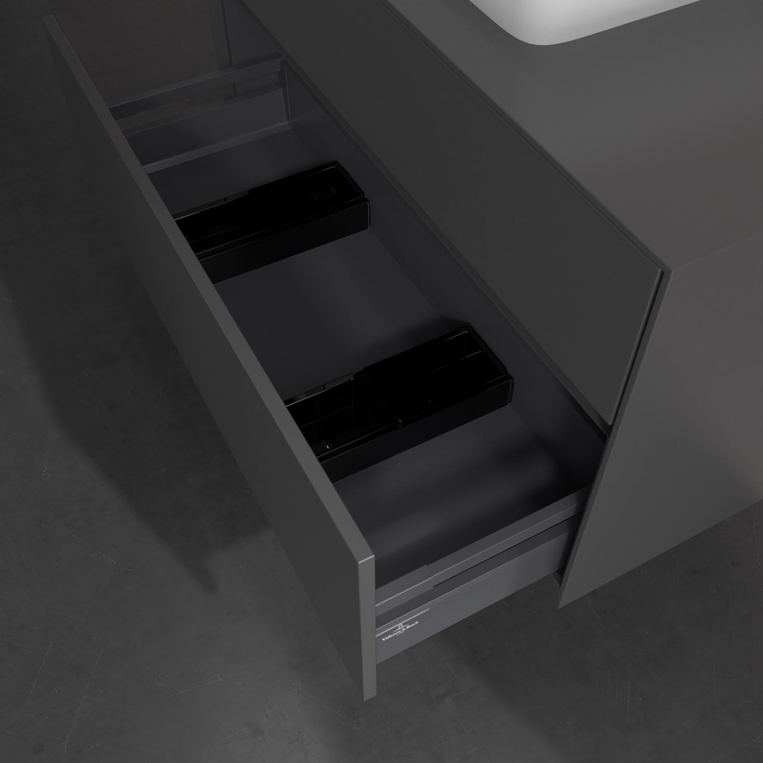Zeitgemäßes Design und feine Linien: Der Villeroy & Boch Waschbeckenunterschrank aus der Collaro Kollektion mit zwei Auszügen glänzt mit vielen Vorzügen. Eine Griffleiste mit integrierter, stufenlos einstellbarer LED-Beleuchtung sorgt für eine schlichte, stimmungsvolle Front. Steuern lässt sich das Licht über einen Touch-Sensor seitlich am Unterschrank. Im Inneren bietet das Möbelstück erstaunlich viel Komfort – ermöglicht durch großzügigen Stauraum und den integrierten Antirutschboden. Die variabel setzbaren Glasabtrennungen und die mitgelieferte Accessory Box bieten Badutensilien ausreichend Platz und sorgen für den nötigen Überblick. Dank SoftClosing und Selbsteinzug lassen sich die Auszüge nach der Nutzung lautlos schließen. Die Front ist mit einer hochwertigen Lackierung versehen, deren Anti-Fingerprint-Oberfläche unschönen Fingerabdrücken vorbeugt.