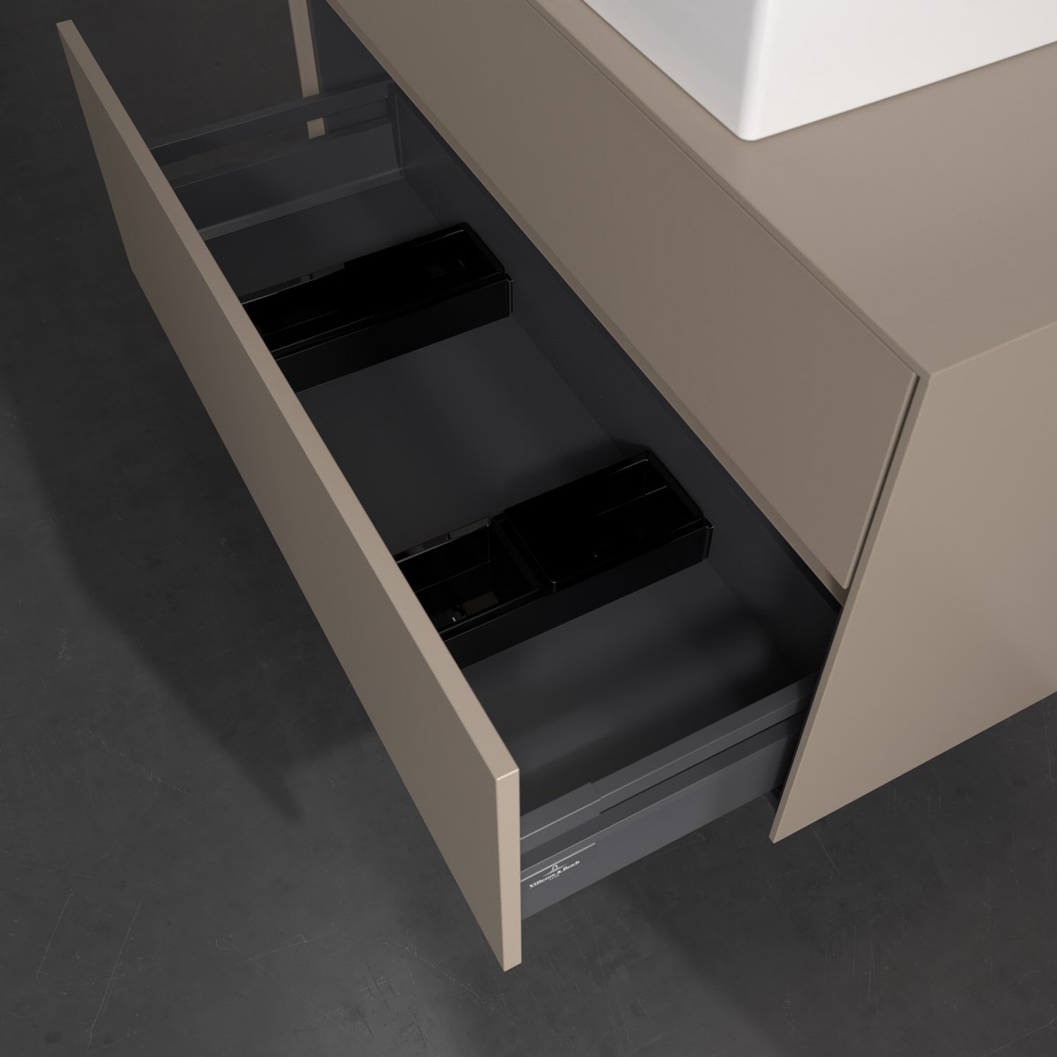 Zeitgemäßes Design und feine Linien: Der Villeroy & Boch Waschbeckenunterschrank aus der Collaro Kollektion mit zwei Auszügen glänzt mit vielen Vorzügen. Eine Griffleiste mit integrierter, stufenlos einstellbarer LED-Beleuchtung sorgt für eine schlichte, stimmungsvolle Front. Steuern lässt sich das Licht über einen Touch-Sensor seitlich am Unterschrank. Im Inneren bietet das Möbelstück erstaunlich viel Komfort – ermöglicht durch großzügigen Stauraum und den integrierten Antirutschboden. Die variabel setzbaren Glasabtrennungen und die mitgelieferte Accessory Box bieten Badutensilien ausreichend Platz und sorgen für den nötigen Überblick. Dank SoftClosing und Selbsteinzug lassen sich die Auszüge nach der Nutzung lautlos schließen. Die Front ist mit einer hochwertigen Lackierung versehen, deren Anti-Fingerprint-Oberfläche unschönen Fingerabdrücken vorbeugt.