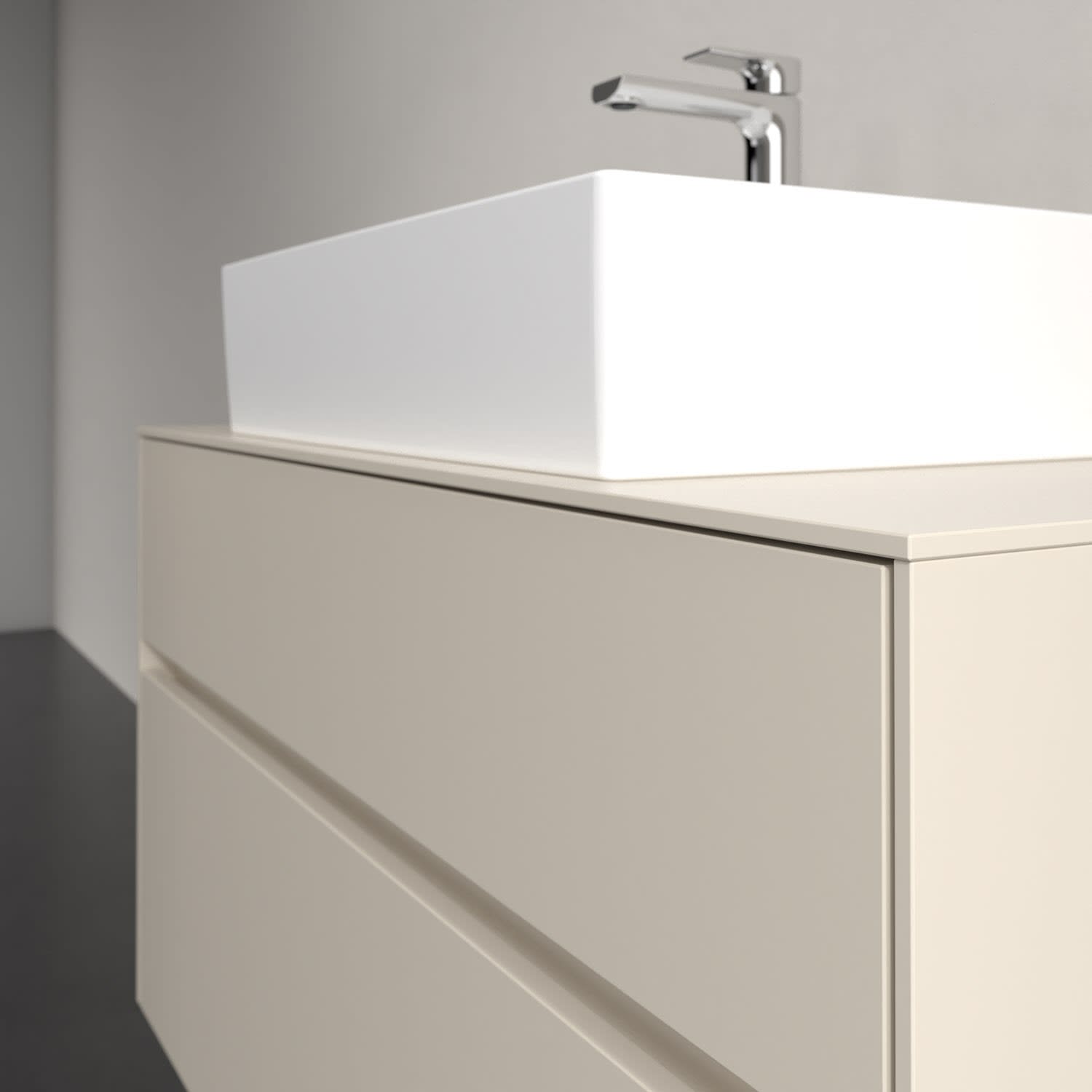 Zeitgemäßes Design und feine Linien: Der Villeroy & Boch Waschbeckenunterschrank aus der Collaro Kollektion mit zwei Auszügen glänzt mit vielen Vorzügen. Eine Griffleiste mit integrierter, stufenlos einstellbarer LED-Beleuchtung sorgt für eine schlichte, stimmungsvolle Front. Steuern lässt sich das Licht über einen Touch-Sensor seitlich am Unterschrank. Im Inneren bietet das Möbelstück erstaunlich viel Komfort – ermöglicht durch großzügigen Stauraum und den integrierten Antirutschboden. Die variabel setzbaren Glasabtrennungen und die mitgelieferte Accessory Box bieten Badutensilien ausreichend Platz und sorgen für den nötigen Überblick. Dank SoftClosing und Selbsteinzug lassen sich die Auszüge nach der Nutzung lautlos schließen. Die Front ist mit einer hochwertigen Lackierung versehen, deren Anti-Fingerprint-Oberfläche unschönen Fingerabdrücken vorbeugt