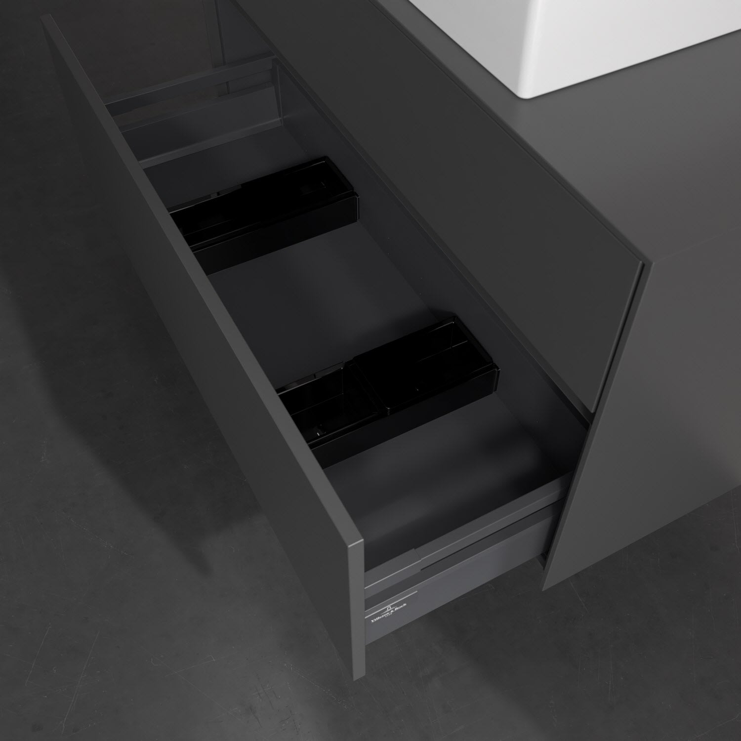 Zeitgemäßes Design und feine Linien: Der Villeroy & Boch Waschbeckenunterschrank aus der Collaro Kollektion mit zwei Auszügen glänzt mit vielen Vorzügen. Eine Griffleiste mit integrierter, stufenlos einstellbarer LED-Beleuchtung sorgt für eine schlichte, stimmungsvolle Front. Steuern lässt sich das Licht über einen Touch-Sensor seitlich am Unterschrank. Im Inneren bietet das Möbelstück erstaunlich viel Komfort – ermöglicht durch großzügigen Stauraum und den integrierten Antirutschboden. Die variabel setzbaren Glasabtrennungen und die mitgelieferte Accessory Box bieten Badutensilien ausreichend Platz und sorgen für den nötigen Überblick. Dank SoftClosing und Selbsteinzug lassen sich die Auszüge nach der Nutzung lautlos schließen. Die Front ist mit einer hochwertigen Lackierung versehen, deren Anti-Fingerprint-Oberfläche unschönen Fingerabdrücken vorbeugt.