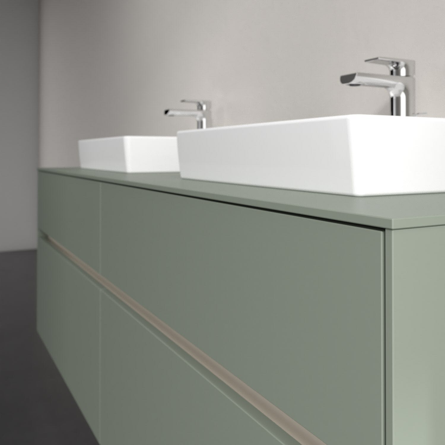 Stauraumwunder im zeitgemäßen Design: Der Villeroy & Boch Waschbeckenunterschrank aus der Collaro Kollektion eignet sich besonders für Familienbäder und bietet genau den Platz, der dort benötigt wird. Stimmungsvolles Highlight der schlichten, modernen Front ist die integrierte Griffmulde mit stufenlos einstellbarer LED-Beleuchtung. Steuern lässt sie sich über einen Touch-Sensor seitlich am Unterschrank. Im Inneren bietet das Möbelstück mit vier Auszügen erstaunlich viel Komfort – ermöglicht durch großzügiges Platzangebot und den integrierten Antirutschboden. Variabel setzbare Glasabtrennungen und mitgelieferte Accessory Boxen sorgen für den nötigen Überblick. Dank SoftClosing und Selbsteinzug lassen sich die Auszüge nach der Nutzung lautlos schließen. Die Front ist mit einer hochwertigen Lackierung versehen, deren Anti-Fingerprint-Oberfläche unschönen Fingerabdrücken vorbeugt.
