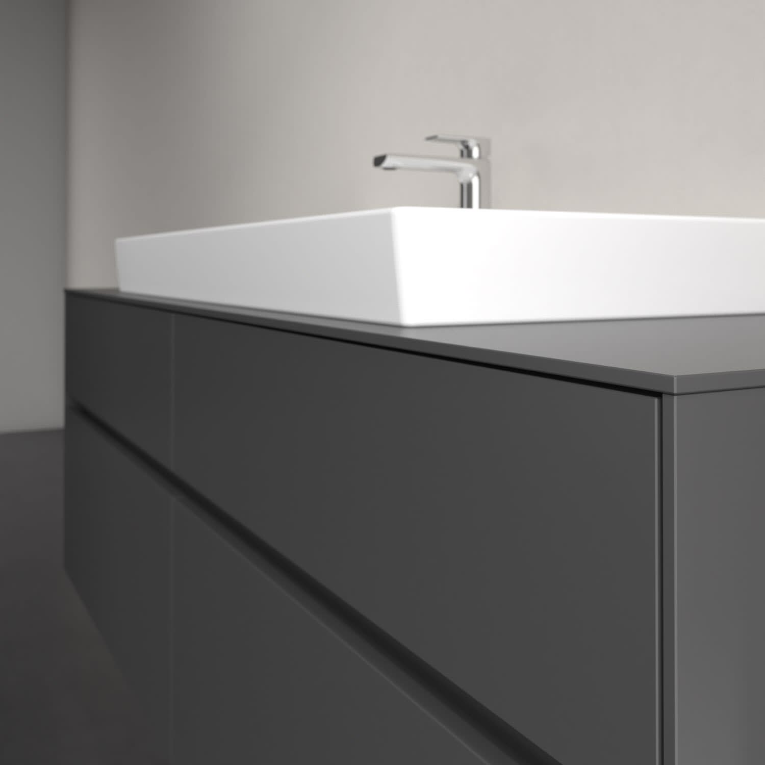 Stauraumwunder im zeitgemäßen Design: Der Villeroy & Boch Waschbeckenunterschrank aus der Collaro Kollektion eignet sich besonders für Familienbäder und bietet genau den Platz, der dort benötigt wird. Stimmungsvolles Highlight der schlichten, modernen Front ist die integrierte Griffmulde mit stufenlos einstellbarer LED-Beleuchtung. Steuern lässt sie sich über einen Touch-Sensor seitlich am Unterschrank. Im Inneren bietet das Möbelstück mit vier Auszügen erstaunlich viel Komfort – ermöglicht durch großzügiges Platzangebot und den integrierten Antirutschboden. Variabel setzbare Glasabtrennungen und mitgelieferte Accessory Boxen sorgen für den nötigen Überblick. Dank SoftClosing und Selbsteinzug lassen sich die Auszüge nach der Nutzung lautlos schließen. Die Front ist mit einer hochwertigen Lackierung versehen, deren Anti-Fingerprint-Oberfläche unschönen Fingerabdrücken vorbeugt.