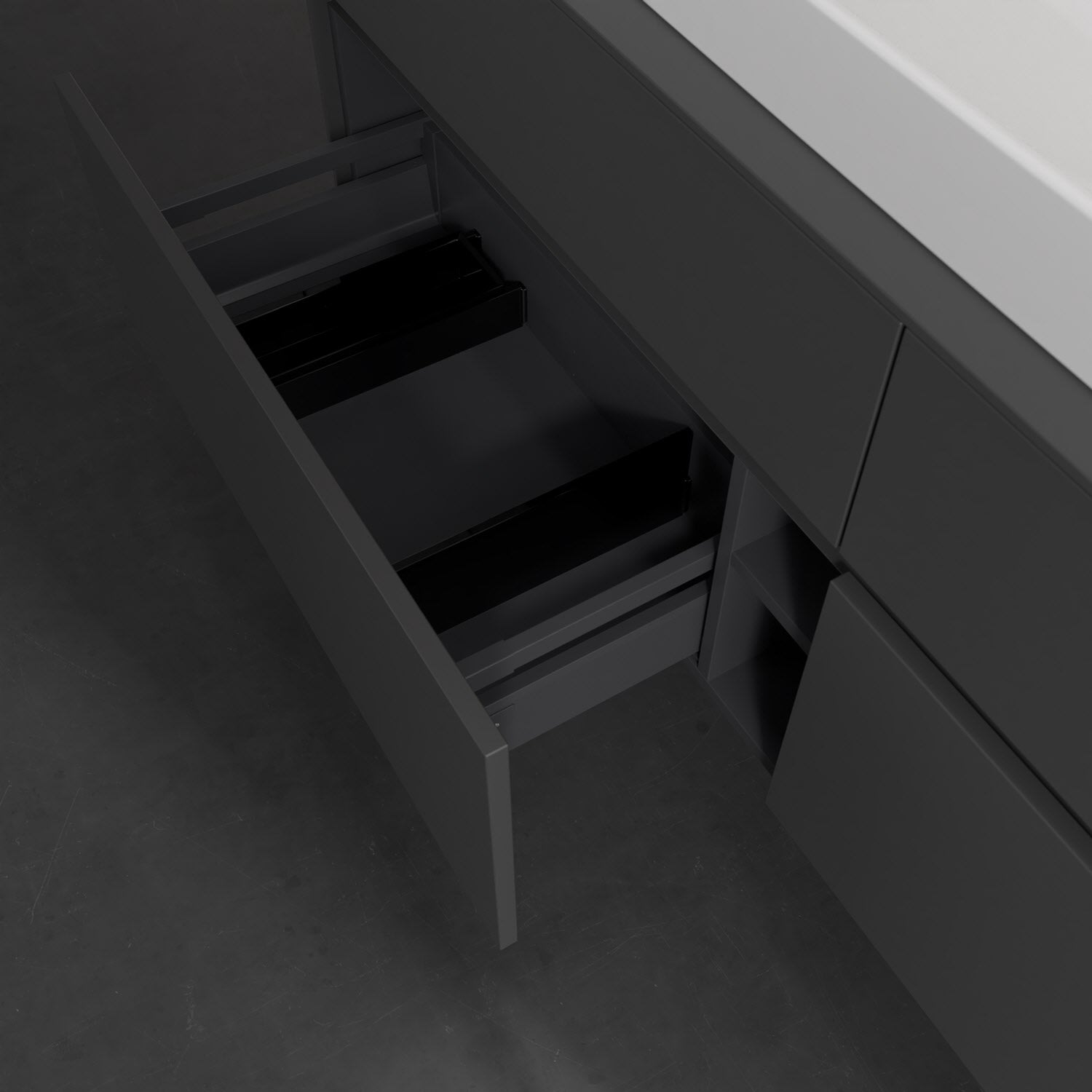 - kein Umfallen oder Verrutschen von Pflegeprodukten in den Schubladen dank rutschhemmendem Boden