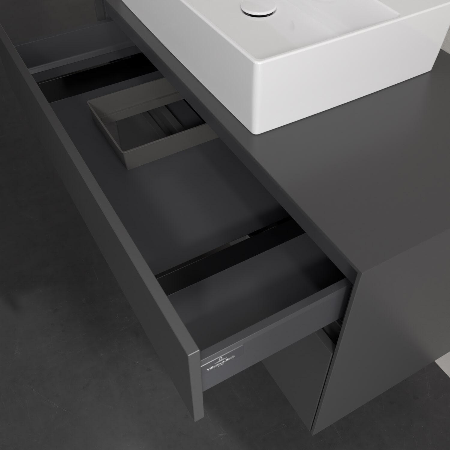 Zeitgemäßes Design und feine Linien: Der Villeroy & Boch Waschbeckenunterschrank aus der Collaro Kollektion mit zwei Auszügen glänzt mit vielen Vorzügen. Eine integrierte Griffleiste sorgt für eine schlichte, moderne Front. Im Inneren bietet das Möbelstück erstaunlich viel Komfort – ermöglicht durch großzügigen Stauraum und den integrierten Antirutschboden. Die variabel setzbaren Glasabtrennungen und die mitgelieferte Accessory Box bieten Badutensilien ausreichend Platz und sorgen für den nötigen Überblick. Dank SoftClosing und Selbsteinzug lassen sich die Auszüge nach der Nutzung lautlos schließen. Die Front ist mit einer hochwertigen Lackierung versehen, deren Anti-Fingerprint-Oberfläche unschönen Fingerabdrücken vorbeugt.